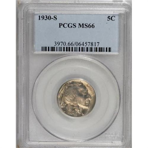 <B>1930-S 5C MS66 PCGS.</B></I> Despite a touch of highpoint softness on each side, this luminous gold-tinged nickel has above-average detail for the issue. The quicksilver surfaces are carefully preserved. PCGS has graded a mere four finer pieces (10/07).<BR><BR><B>Coin Engraver:</B> James E. Fraser<BR><BR><b>Shipping:</b> Coins & Currency (<a target="_blank" href="http://www.heritageauctions.com/common/shipping.php">view shipping information</a>)