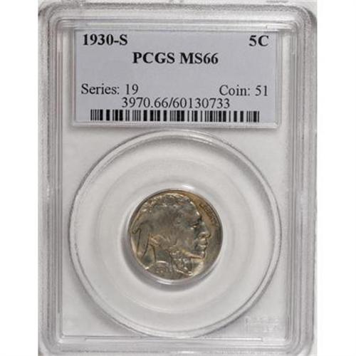 <B>1930-S 5C MS66 PCGS.</B></I> Warm gold and nickel-gray shadings drape the quicksilver surfaces of this delightful Premium Gem. Well struck and pleasingly preserved. PCGS has graded just four finer pieces (11/07).<BR><BR><B>Coin Engraver:</B> James E. Fraser<BR><BR><b>Shipping:</b> Coins & Currency (<a target="_blank" href="http://www.heritageauctions.com/common/shipping.php">view shipping information</a>)