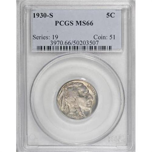 <B>1930-S 5C MS66 PCGS.</B></I> This Premium Gem exhibits satiny luster with full mint brilliance on each side. The surfaces have light gold toning that adds to its overall eye appeal. PCGS has only certified four finer examples of the date.<BR><BR><B>Coin Engraver:</B> James E. Fraser<BR><BR><b>Shipping:</b> Coins & Currency (<a target="_blank" href="http://www.heritageauctions.com/common/shipping.php">view shipping information</a>)