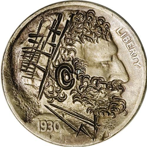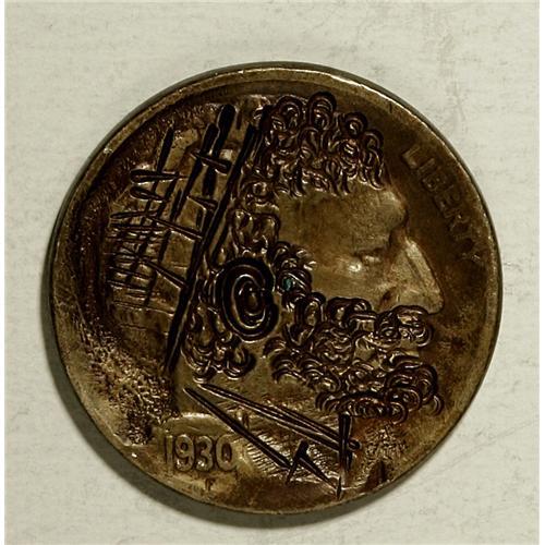 <B>1930-S:</B></I> Another original by "Bo" from the same time frame, probably a bit later after he had started using the "C" punch for the ear. Cleverly, he also used a (smaller) "C" punch, at an angle, so the bottom of the punch did not penetrate the metal, for the hair and beard. A cross-hatched hat well back on the head, unaltered profile, and darkened coin further affirm this is a post-1957 work (Below Average) by "Bo" on a Fine host 1930-S.<BR><BR><b>Shipping:</b> Coin/Currency (<a target="_blank" href="http://www.heritageauctions.com/common/shipping.php">view shipping information</a>)
