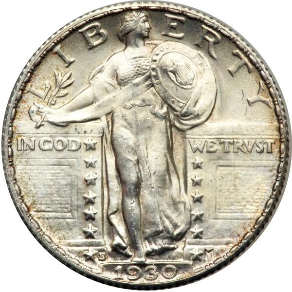 1930-S Liberty Standing Quarter Dollar. PCGS graded MS-66 Full Head. Well struck and lightly toned. A resplendent Gem, final year of issue. Pop 83; 17 finer (PCGS # 5781) .