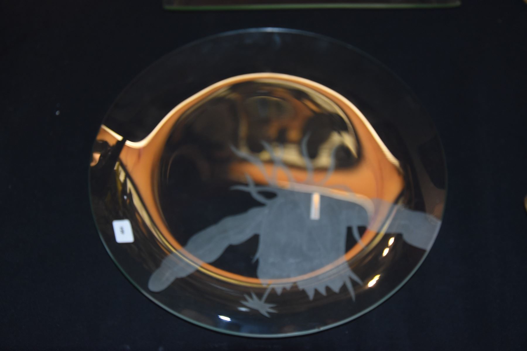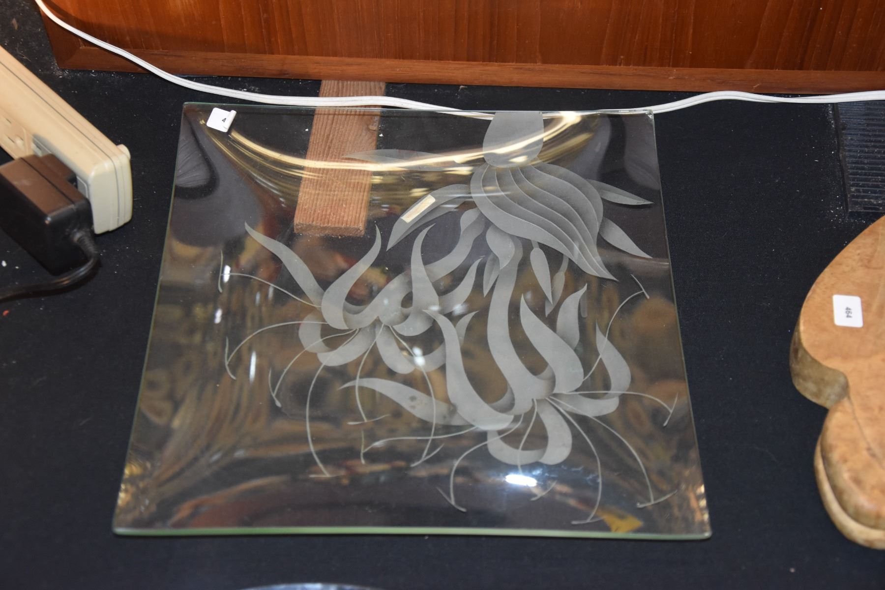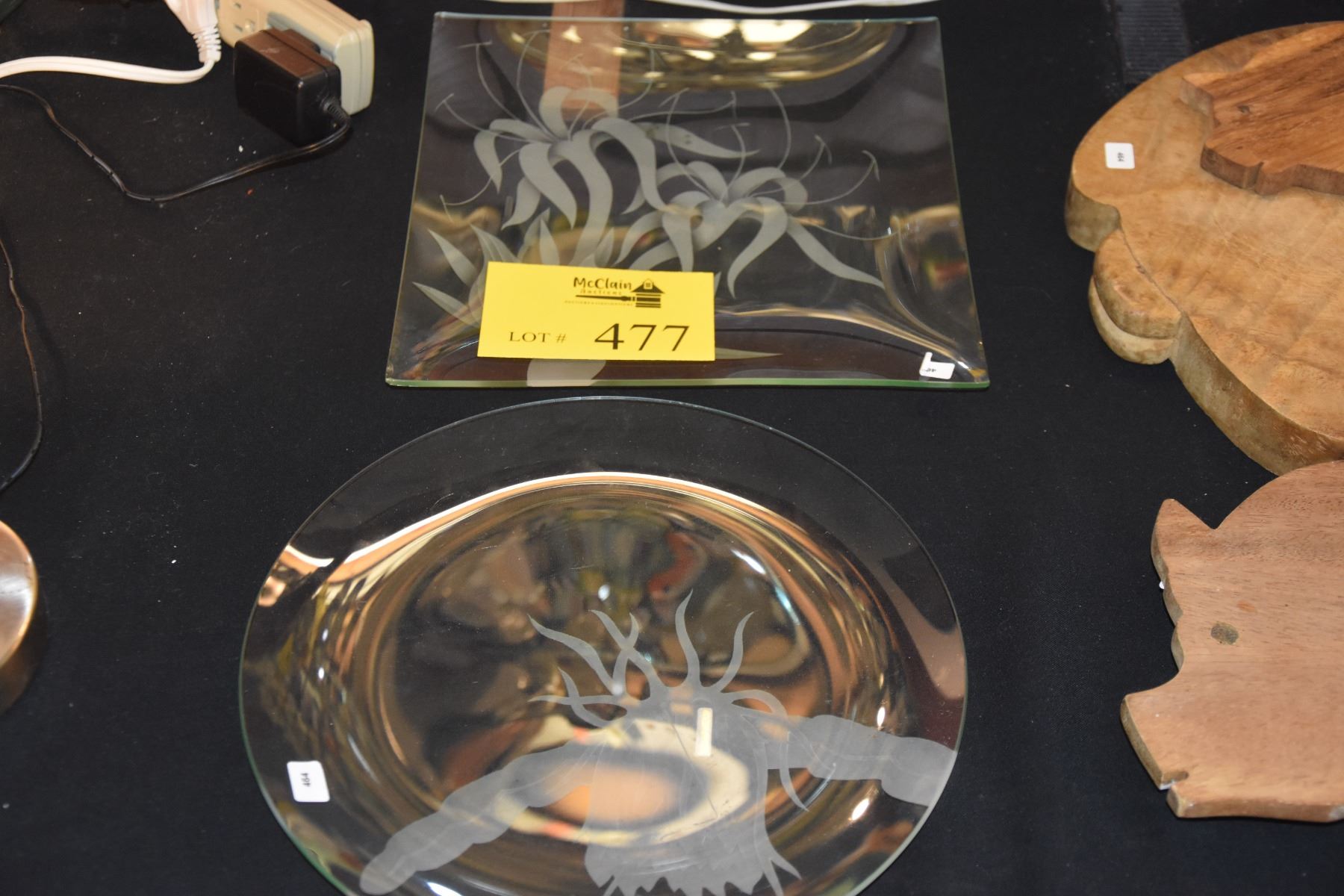 1930'S MARGARET FLEMING GROSSMAN/MOODY ETCHED SQUARE PLATE & DOROTHY THORPE FOR GUMPS ROUND ETCHED PLATE (SMALL CHIPS ON EDGE) (2 PCS)