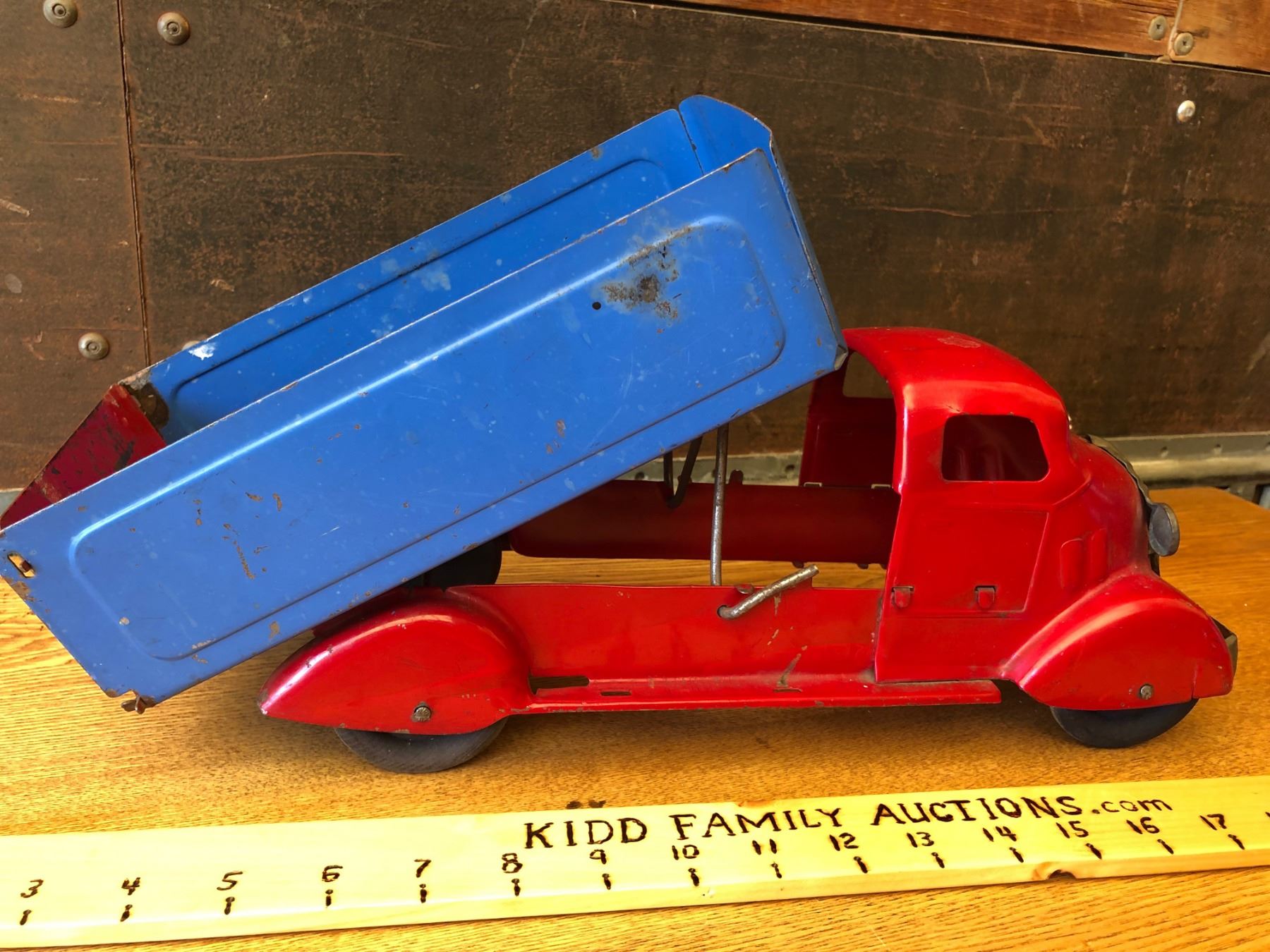 1930'S TIN DUMP TRUCK WITH WOOD WHEELS