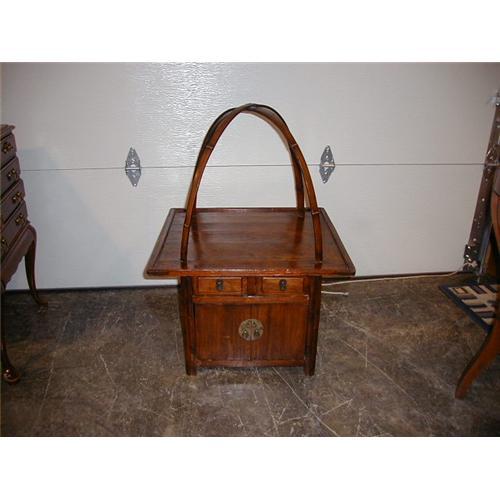This is such a beautiful and unusual piece. Originating in Shandong, China circa 1930, this was used to display and serve food. The raised section is for a cloth, which would cover the food and act as protection against insects. The wood, which is bamboo and elm, is really beautiful. There are two drawers and one storage area with beautiful hardware on the fronts. The corners have a metal strip which is a nice added detail. There are some nicks and scratches and the wood is chipped around the drawers but overall the piece is in good condition. The cabinet measures 38 1/2" in height, and is 25 3/4" square. The bottom part of the cabinet is 18" in height, 19 1/2" from left to right and 20" front to back. We do have more photographs that we can email if you are interested. Please contact us with