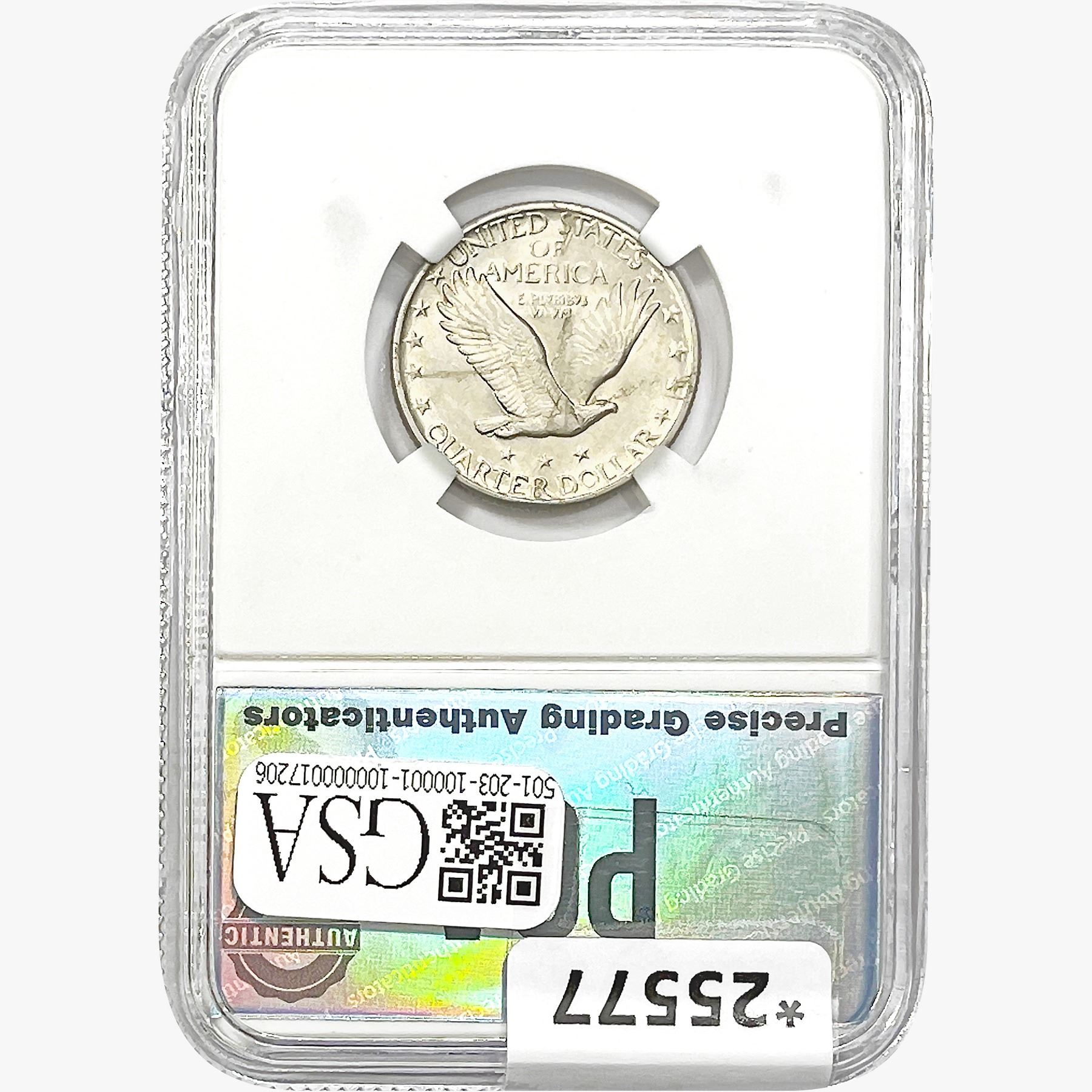 COINS AND CURRENCY LISTED IN GSA’S CATALOG AS GRADED AND ENCAPSULATED BY PCGS, NGC, ANACS, ICG, PCGS CURRENCY, PMG, PCGS BANKNOTE GRADING, CMC OR ANY OTHER THIRD-PARTY GRADING SERVICE ARE LIKEWISE SOLD “AS-IS” EXCEPT AS EXPRESSLY SET FORTH HEREIN. ALL THIRD-PARTY GRADING SERVICE GUARANTEES, INCLUDING AUTHENTICITY, ARE THE SOLE RESPONSIBILITY OF THE THIRD-PARTY GRADING SERVICE AND NOT WARRANTIES OR GUARANTEES OF GSA. BIDDERS SHOULD CONTACT THESE THIRD-PARTY GRADING SERVICES DIRECTLY WITH RESPECT TO ANY CLAIMS OR QUESTIONS THEY MAY HAVE CONCERNING THEIR GUARANTEES AND WARRANTIES. BIDDERS ACKNOWLEDGE AND AGREE THAT AUCTIONEER IS NOT BOUND BY OR LIABLE FOR ANY OPINION OR CERTIFICATION BY ANY THIRD-PARTY GRADING SERVICE. REMOVAL OF A PRODUCT FROM ITS PROTECTIVE CASING OR HOLDER OR ALTERATION OF ANY COIN HOLDER WAIVES ALL RIGHTS CONCERNING THE PRODUCT CONTAINED THEREIN.