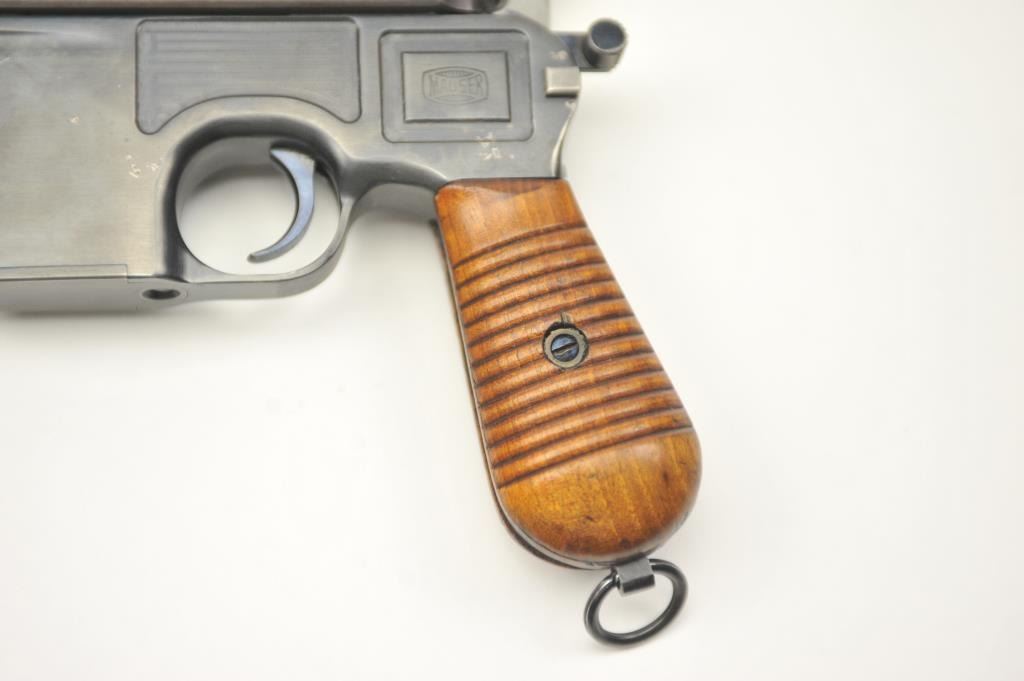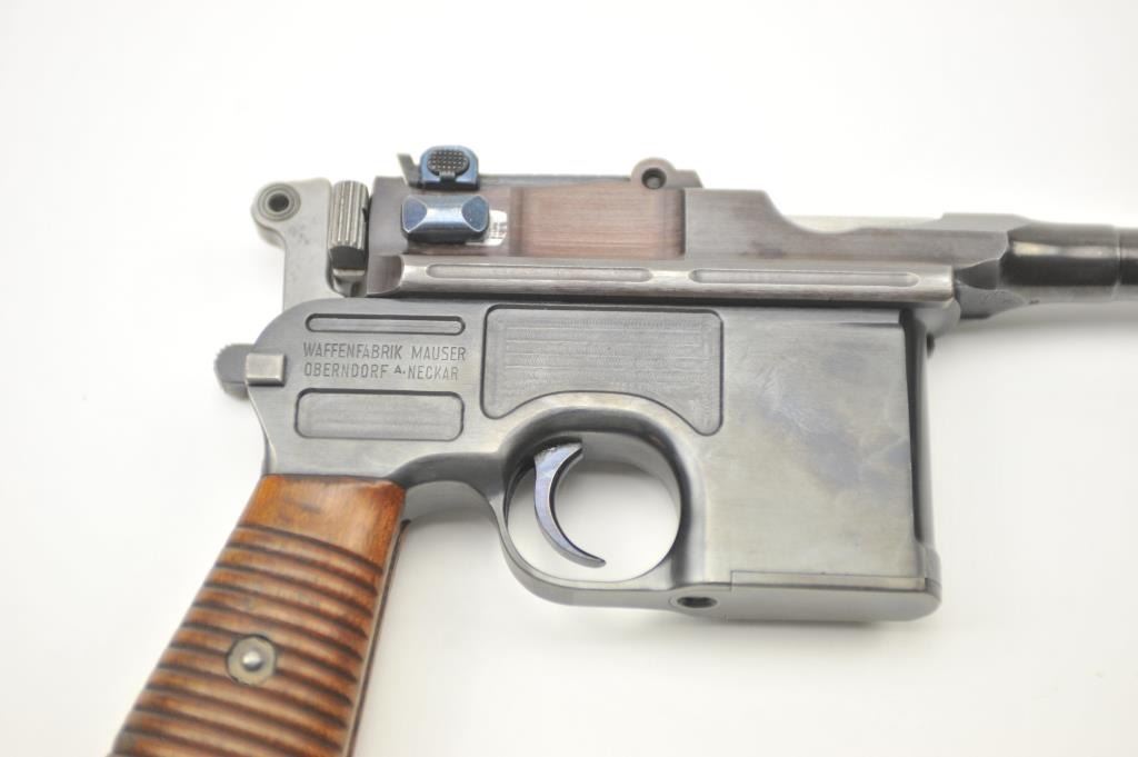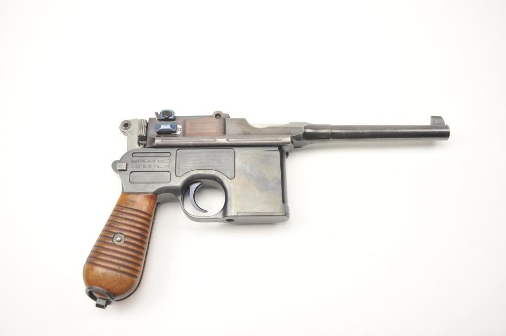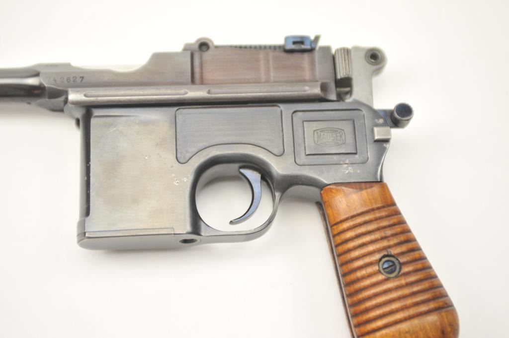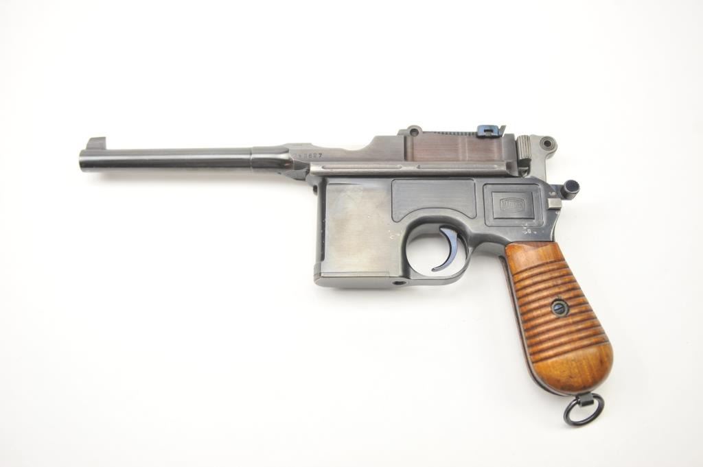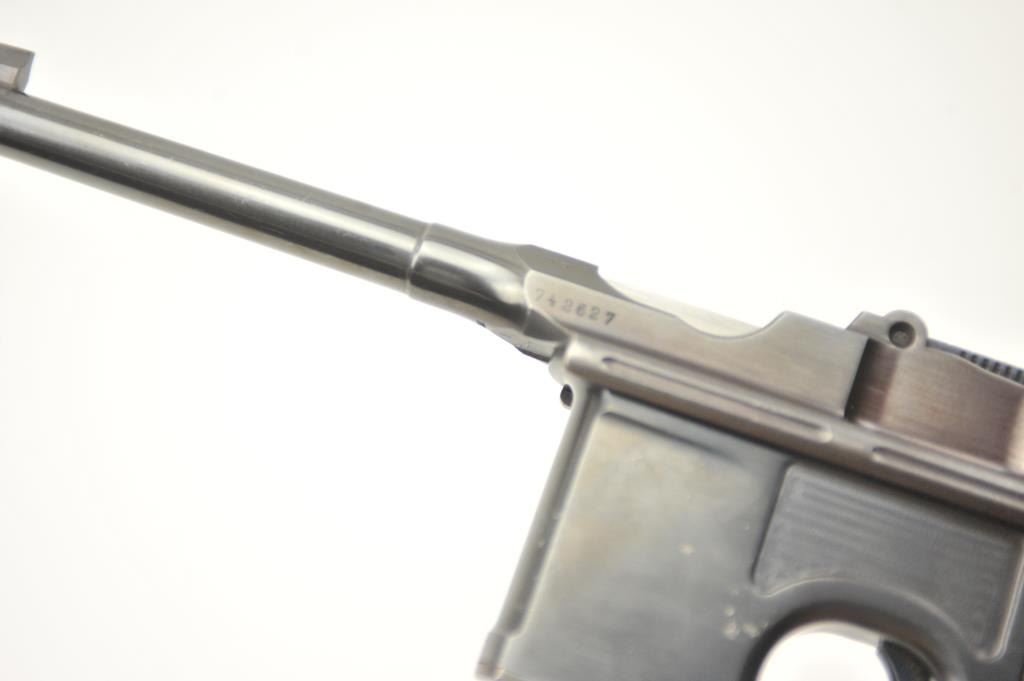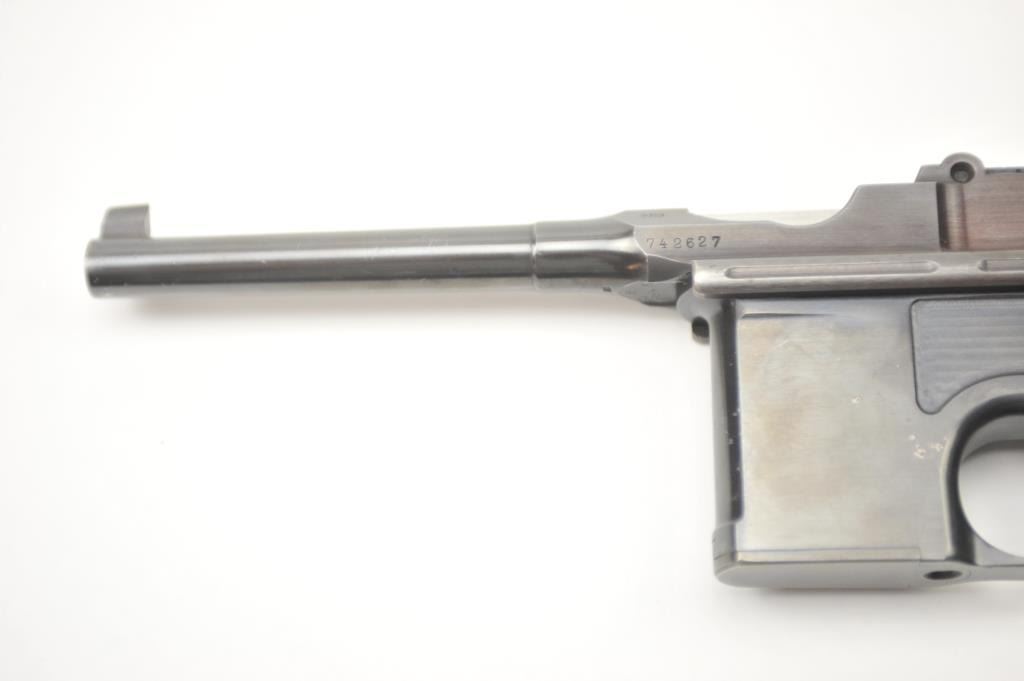1930 “Step Barrel” commercial Mauser broom handle in .30 caliber with banner on the left side of the frame, S/N 742627. 90%-95% bright original commercial high polish blue with some drifting to the plum and brightniter blue on small parts and rear sight. Excellent grips. Some small scratches from stock holster and attachment. Matching visible numbers. Bore is bright with pristine interior. A strong 8.5-9 on a 1-10 scale.(C&R/PPT) Est.: $1400-$2800