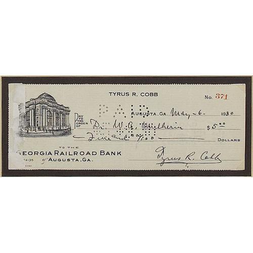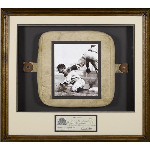 <B>1930 Ty Cobb Signed Check Display.</B></I> Gorgeous display piece is highlighted by a desirable early Cobb check drawn from the Hall of Fame legend's Augusta, Georgia account. Most checks from the Georgia Peach tend to be later and smaller than this 3x8" specimen, which is filled out and signed entirely in Cobb's 10/10 black fountain pen ink. Three vertical folds and some paper loss at left edge do not affect the writing or signature in any noteworthy fashion. The check is beautifully displayed in a shadow box frame featuring the famous photo of Cobb attacking third base, which rests upon an actual base dating to the era of Cobb's dominance. Total dimensions are 27x31x4". <I>LOA from James Spence Authentication. LOA from PSA/DNA.</B></I><BR><BR><b>Shipping:</b> Framed - with Glass, Medium (<a target="_blank" href="http://www.heritageauctions.com/common/shipping.php">view shipping information</a>)