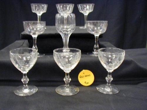 1930 WHITE WINE STEMWARE INCLUDES (3) 3 7/8in CUT inSin IN WREATH CUT STEMS, (1) 5 1/8in EAPG C.1870 WINE , (2) 4 3/8in 1930 TEAR DROP BASE, (3) 4 1/4in 1930 FLORAL ETCHED. 9 PC