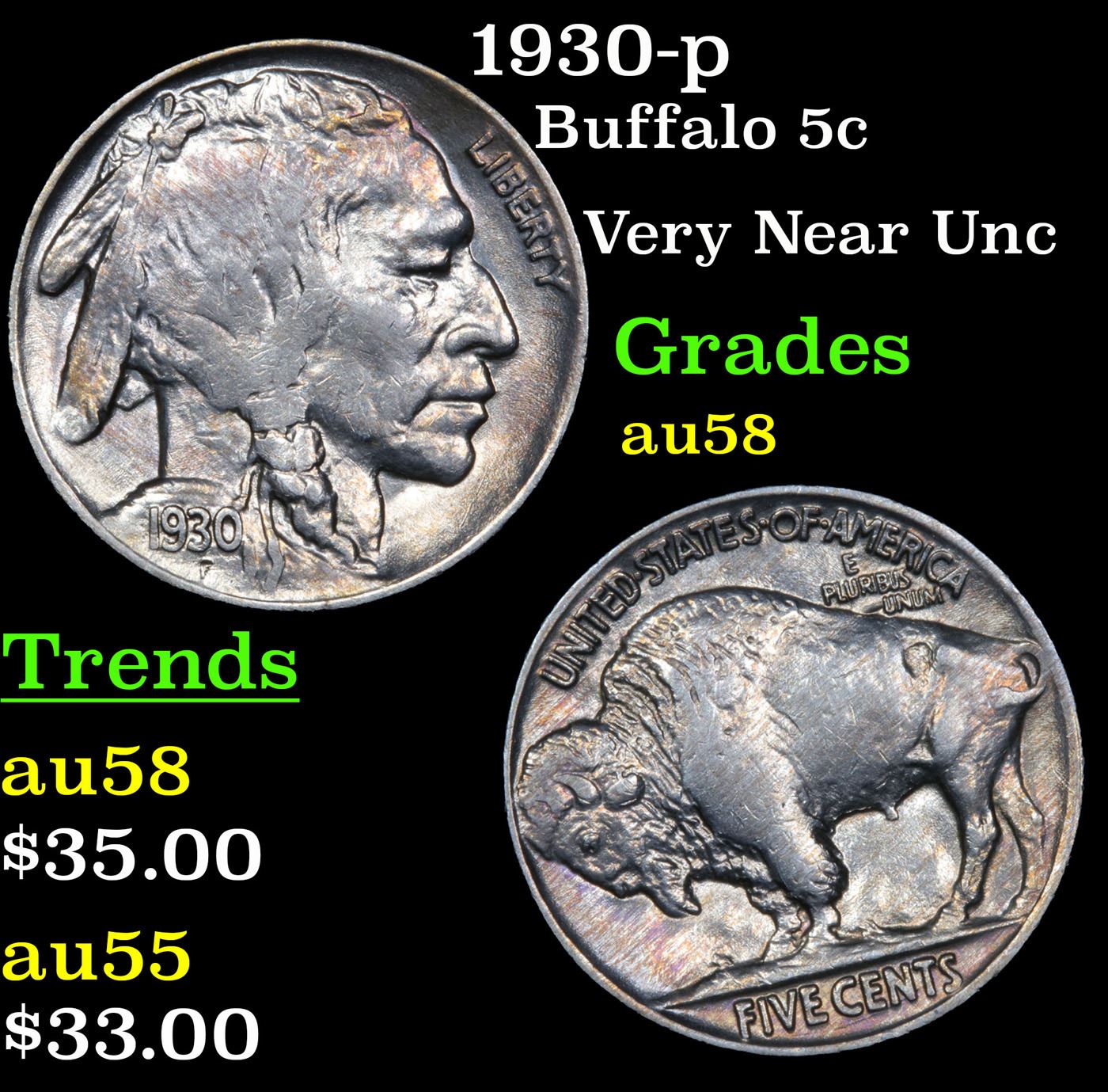 1930-p Buffalo Nickel 5c Grades Choice AU/BU Slider.