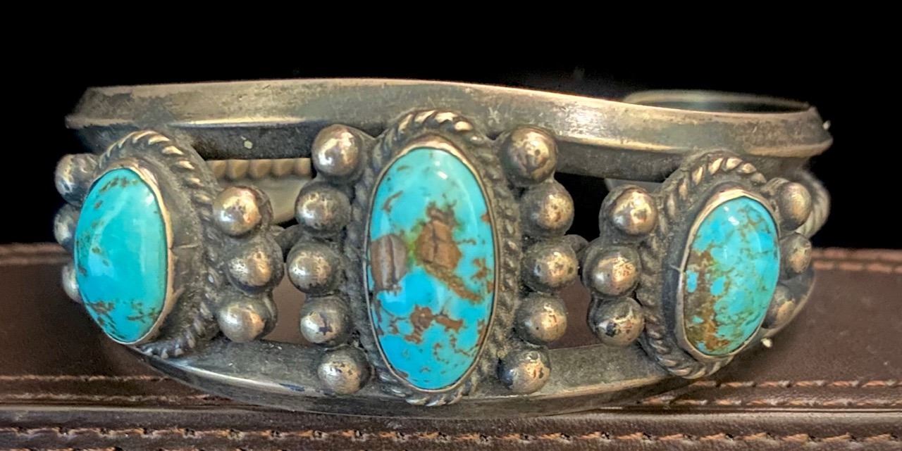 1930's 3 stone Kingman Turquoise Cuff 1"H X 5 3/8" inside X 1 1/4"opening. 50 grams Lovely piece