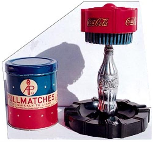 Nice piece in good overall cond. Nice plating remains on the bottle, no chips or cracks on the bakelite base or top and very strong decals on all 4 sides with only some tiny nicks and very minuscule chips of any sort. Comes complete with a brand new matchpack and an empty tin that used to hold 2 of the matchpack refills. Nice strong example, cond. 8.3-8.8+. Stands 7" tall.