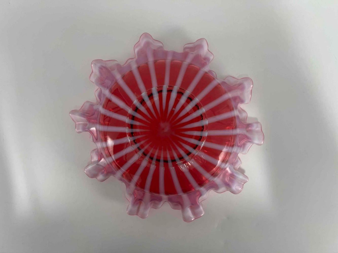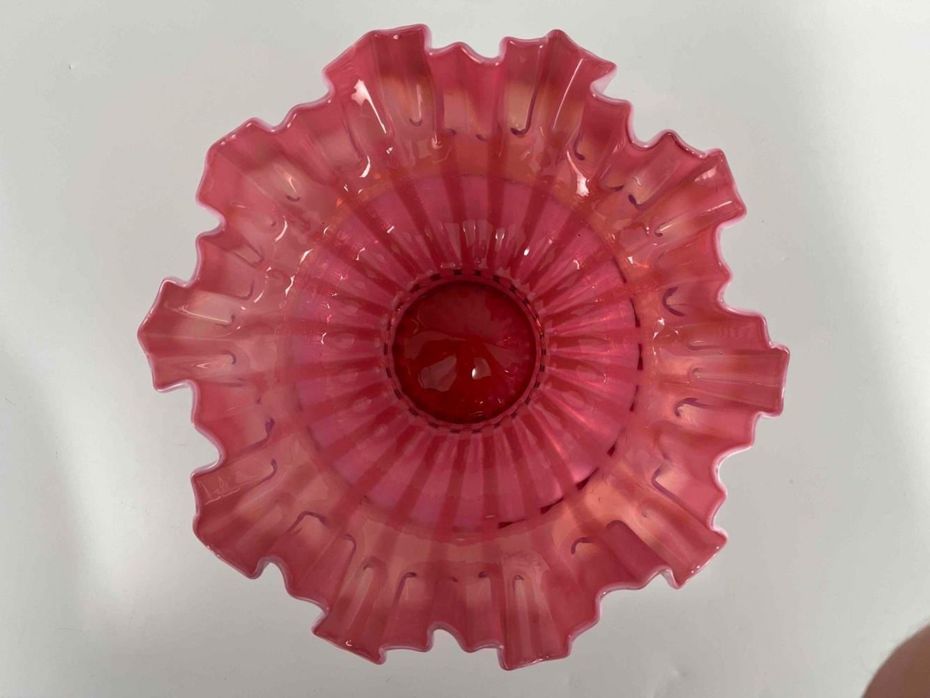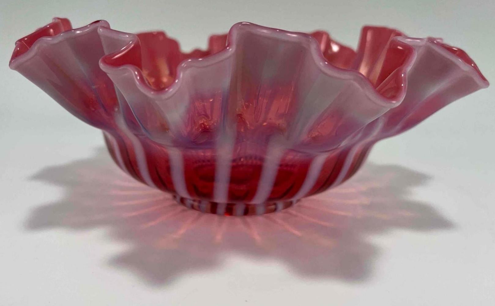 1930's-40's Cranberry Glass Ribbon Bowl. Unmarked. Approximately 10.5W x 4.0H in.