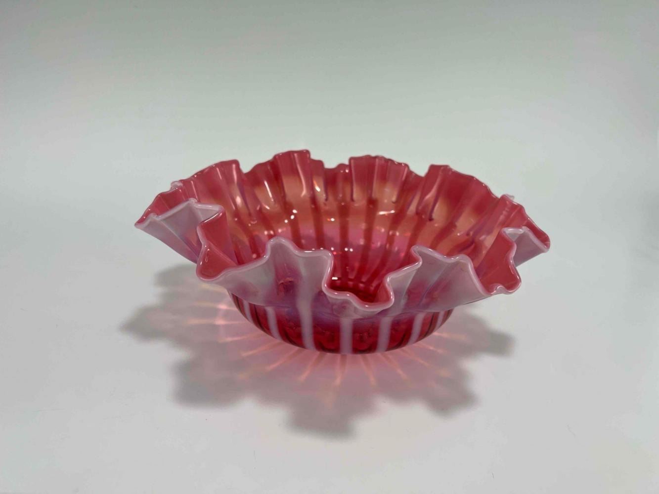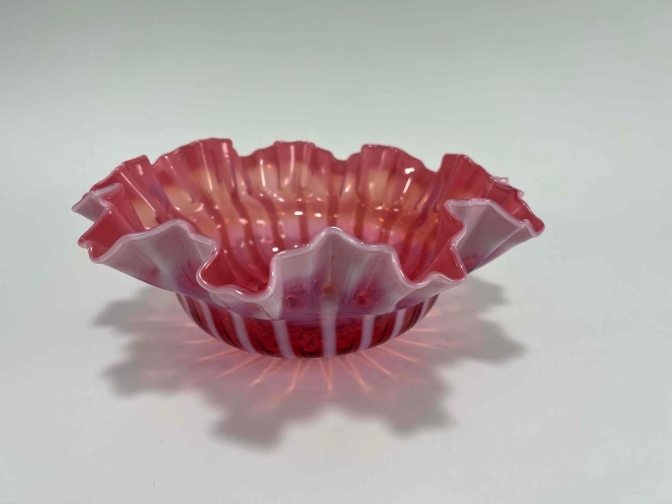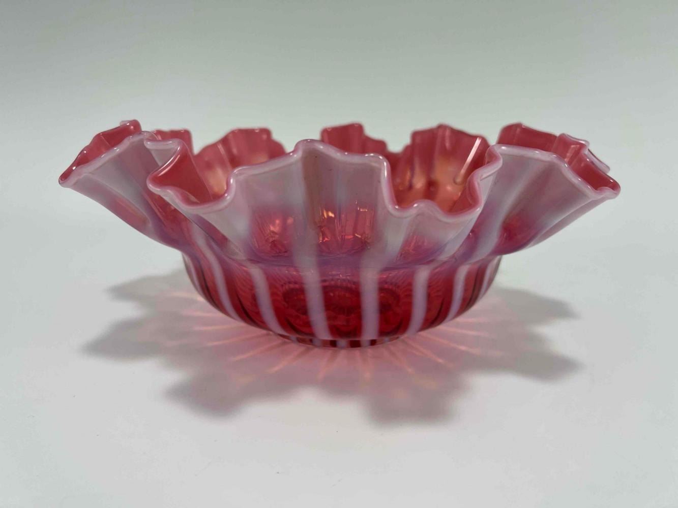 1930's-40's Cranberry Glass Ribbon Bowl. Unmarked. Approximately 10.5W x 4.0H in.