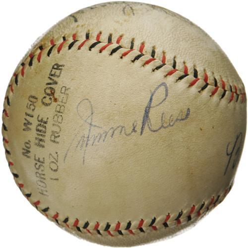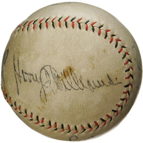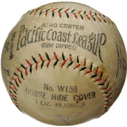 <B>1930's Babe Ruth Signed Baseball.</B></I> A magnificent sweet spot signature from the greatest Yankee of them all gives this Pacific Coast League ball the look of a $30,000 single, though side panel signatures from fellow Yanks Harry Williams (1913-14) and Jimmie Reese (1930-31) will make the sphere far more affordable for those seeking a top-flight Ruth autograph on a baseball. One shouldn't turn up his nose at the signers who share space with the Bambino however, as Williams carries strong appeal for his early service to the New York Americans, and Reese gained some degree of fame as the Babe's roommate for his oft-quoted remark regarding Ruth's hard-partying ways: "I don't bunk with the Babe. I just bunk with his suitcase." Each of these autographs are equal in strength to the Babe's 8/10 offering. The ball itself shows light, even toning with just a hint of foxing well clear of the all-important Ruth. A fine playing days Ruth autograph for the serious collector. <I>LOA from PSA/DNA. LOA from James Spence Authentication.</B></I><BR><BR><b>Shipping:</b> Balls, Pucks, etc., Small (<a target="_blank" href="http://www.heritageauctions.com/common/shipping.php">view shipping information</a>)