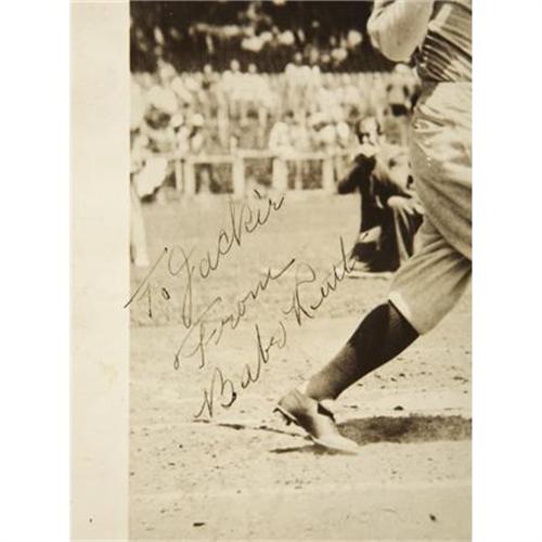 <B>1930's Babe Ruth Signed Photograph.</B></I> Classic image of the left-handed swing that launched 714 long balls is printed to dimensions of 8x10" and subsequently blessed by a brief inscription and signature from the subject. Ruth's black fountain pen ink reads, "To Jackie, From Babe Ruth," supplied at a strength of a conservative 8/10. The wide border at the lower left hand corner is chipped, but a simple matting job will hide that flaw entirely. The wonderful silver gelatin print is otherwise quite clean, with no creasing and only a slight instance of a surface abrasion which is effectively camouflaged by the white-shirted crowd in the background. Go ahead and tell your buddies that this photo came out of the Robinson estate. It's not the truth, but what's a harmless little fib between friends? <I>LOA from PSA/DNA. LOA from James Spence Authentication.</B></I><BR><BR><b>Shipping:</b> Flat Material, Small (<a target="_blank" href="http://www.heritageauctions.com/common/shipping.php">view shipping information</a>)