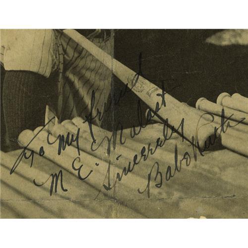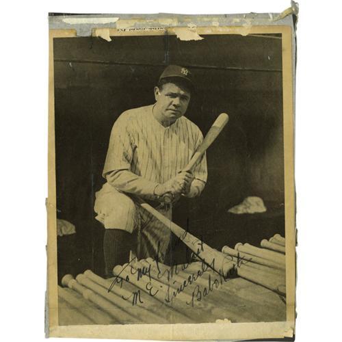 <B>1930's Babe Ruth Signed Photograph.</B></I> The Bambino poses with the tools of his trade in this classic image of baseball's greatest drawing card. A strong black fountain pen inscription, rating a solid 8/10 in quality, reads, "To my friend M.E. Malast, Sincerely Babe Ruth." The image measures approximately 8x10", and appears to be a magazine photo that was once folded and later flattened and glued to a cardboard backing. One vertical fold crosses the inscription area (though not the autograph), but the fold lines do not distract the eye significantly. Some wear appears at upper and lower borders as well, but when properly matted and framed the image will present magnificently. A striking piece, worthy of a home in the finest of collections. <I>LOA from PSA/DNA.</B></I> <BR><BR><B>Important notice:</B> Heritage usually auctions material at the rate of 200-250 lots per hour. On some occasions eBay Live bid software or the Internet may not be able to keep up with the pace of the auction. We recommend placing a realistic absentee bid now as insurance to avoid disappointment. Occasionally the auctioneer may eliminate or reject an eBay Live bid, and the auctioneer may also reopen a lot after the close of the eBay live bidding (usually because we missed an audience bid), and may reject your bid even if it shows you as the winning bidder. By bidding via eBay Live, you agree that Heritage may award the lot to another bidder at its sole discretion under the circumstances described above or any other reasonable circumstances. Since eBay bids are not shown to us until we open the lot on the floor, we treat those bids just like floor bids. In most cases the floor responds before the eBay bid is presented to us, due to Internet lag time, so for consistency we have made it a policy that floor bids are always considered first over tie eBay live bids. Also please note that all Heritage lots purchased through eBay Live carry a 22.5% Buyer's Premium. Please make sure you read the Terms and Conditions before you bid. This lot is being auctioned in conjunction with a live floor auction by Heritage Galleries & Auctioneers. All final auction and invoice information will be supplied by Heritage Galleries & Auctioneers, and all other information should be considered preliminary. Lot:19062 <BR><BR><B>Winning Notification and Billing:</B> After the FINAL session in this auction is complete, Heritage will send e-mail and snail mail invoices. This process normally takes several days. All final auction and invoice information will be supplied by Heritage Galleries & Auctioneers, and all other information should be considered preliminary. <BR><BR>This auction will be conducted on a live auction floor and over the Internet through eBay Live. If you choose to place an absentee bid, please take a moment to <font color='#0000ff'><u><a href='http://pages.ebay.com/liveauctions/help/before/laabsentee.html'>learn how eBay Live absentee bidding works</a></u></font><font color='#000000'>