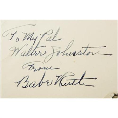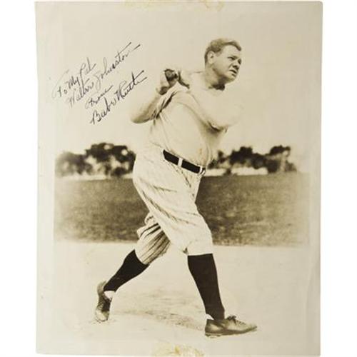 <B>1930's Babe Ruth Signed Photograph.</B></I> Remove one letter from the inscription and this signed photo goes from just fantastic to outrageously stupendous! But we've confirmed that the Babe didn't misspell the recipient's surname, and that this photo was not a gift to the Hall of Fame Washington Senators pitcher. But rather than dwell on what might have been, we'll instead celebrate the bona fide 10/10 strength of the bold fountain pen inscription that reads, "To My Pal Walter Johnston From Babe Ruth." It appears at upper left of this classic 8x10" image of the Bambino taking his cuts down at St. Petersburg's spring training camp. A vertical bend just right of center will only be apparent at certain angles to the light, and tape staining at top and bottom borders is likewise benign. A simple matting and framing job should result in a NRMT appearance for the photo, with the Babe's ink remaining a cut above even that lofty stature. <I>LOA from PSA/DNA. LOA from James Spence Authentication.</B></I><BR><BR><b>Shipping:</b> Flat Material, Small (<a target="_blank" href="http://www.heritageauctions.com/common/shipping.php">view shipping information</a>)