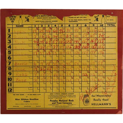 <B>1930's Babe Ruth Signed Oversized Bowling Scorecard.</B></I> Proving that there was no sport he couldn't master, the Bambino rolled a 196 and a 191 in two games at a New Jersey alley in a friendly game with Big League buddy Jack Salveson. While it's the Babe's enormous (five inches long!) red crayon signature at lower right that will catch most collectors' eyes, it must be noted that all scoring is done in the Yankee legend's hand as well, including the two rows of his own personal scoring which begins with his unmistakable "Babe" autograph. That's three Ruth autographs for the price of one! The oversized scorecard (17x20") shows paper loss along upper edge, but nothing that even approaches the bowling scores, much less the autographs themselves. Certainly the largest Ruth autographs in this auction, and among the largest on earth! Buddies Salveson and Russ Millett have signed at lower right as well. Matted and framed to 21x25". <I>LOA from PSA/DNA.</B></I>