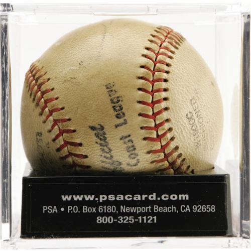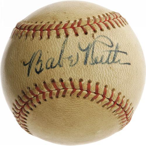<B>1930's Babe Ruth Single Signed Baseball, PSA NM+ 7.5.</B></I>  The Bambino's appearance on a Pacific Coast League baseball suggests that he was on some sort of California excursion when he applied his booming blue ink sweet spot signature.  While we cannot be certain of the circumstances, we can be about the quality, as PSA/DNA granted the score of "8" out of ten for this all-important autograph.  The ball's grade of "6" out of ten accounts for the composite score as listed.  We've said it before, but we'll say it again--no serious baseball autograph collection can be absent a quality Ruth single.  Furthermore, those among our vast Heritage Auction Galleries clientele considering diversifying their collections to include sporting artifacts would find this a solid foundation upon which to build.  As always, buy quality and you can't go wrong.  <I>LOA from PSA/DNA.</B></I> <BR><BR><B>Important notice:</B> Heritage usually auctions material at the rate of 200-250 lots per hour. On some occasions eBay Live bid software or the Internet may not be able to keep up with the pace of the auction. We recommend placing a realistic absentee bid now as insurance to avoid disappointment. Occasionally the auctioneer may eliminate or reject an eBay Live bid, and the auctioneer may also reopen a lot after the close of the eBay live bidding (usually because we missed an audience bid), and may reject your bid even if it shows you as the winning bidder. By bidding via eBay Live, you agree that Heritage may award the lot to another bidder at its sole discretion under the circumstances described above or any other reasonable circumstances. Since eBay bids are not shown to us until we open the lot on the floor, we treat those bids just like floor bids. In most cases the floor responds before the eBay bid is presented to us, due to Internet lag time, so for consistency we have made it a policy that floor bids are always considered first over tie eBay live bids. Also please note that all Heritage lots purchased through eBay Live carry a 22.5% Buyer's Premium. Please make sure you read the Terms and Conditions before you bid. This lot is being auctioned in conjunction with a live floor auction by Heritage Galleries & Auctioneers. All final auction and invoice information will be supplied by Heritage Galleries & Auctioneers, and all other information should be considered preliminary. Lot:19009 <BR><BR><B>Winning Notification and Billing:</B> After the FINAL session in this auction is complete, Heritage will send e-mail and snail mail invoices. This process normally takes several days. All final auction and invoice information will be supplied by Heritage Galleries & Auctioneers, and all other information should be considered preliminary.  <BR><BR>This auction will be conducted on a live auction floor and over the Internet through eBay Live. If you choose to place an absentee bid, please take a moment to <font color='#0000ff'><u><a href='http://pages.ebay.com/liveauctions/help/before/laabsentee.html'>learn how eBay Live absentee bidding works</a></u></font><font color='#000000'>