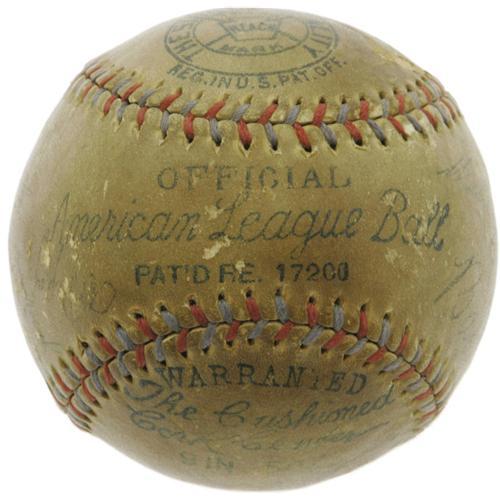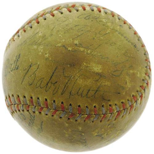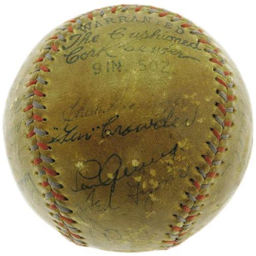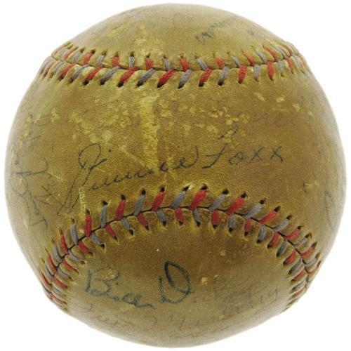 <B>1930's Baseball Legends Multi-Signed Baseball with Ruth, Gehrig.</B></I> Upon first glance, it would seem that this godly sphere derives from the 1934 Tour of Japan, and we still aren't entirely convinced that there is no connection. The cast of characters just bears too close of a resemblance to the team that crossed the Pacific: Ruth, Gehrig, Foxx, Gomez, Gehringer. But perhaps it is just that greatness tends to stick together, as other names of superstars that stayed stateside are here as well: Dickey, Cochrane, Manush, Simmons, Cronin, Grove, Lopez, Lyons and Rick Ferrell among them. Fourteen Hall of Famers in all have made their mark on this deeply toned OAL (Harridge) orb, with only three others present that have been locked outside the gates of Cooperstown. The improbability of finding a single baseball with such a baseball pantheon borders on the astronomical, and just a fraction of that theoretical population could match the strong condition of the signatures found here. Only Farrell (1/10), Gehringer (3/10) and Lopez (3/10) cause any amount of eye strain, with the remainder of the Cooperstonians averaging 7/10 in quality. So many great hands have held this remarkable piece--will yours be next? <I>LOA from PSA/DNA. LOA from James Spence Authentication.</B></I><BR><BR><b>Shipping:</b> Balls, etc. (<a target="_blank" href="http://www.heritageauctions.com/common/shipping.php">view shipping information</a>)