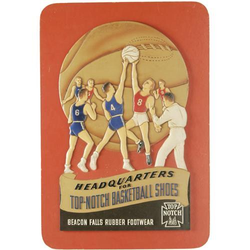 <B>1930's Basketball Advertising Counter Display.</B></I> You'll be hard-pressed to find a basketball advertising sign that predates this beautiful example, much less one that can compete in aesthetics or condition. This colorful marvel is constructed of pressed board, giving the piece a three-dimensional design rarely seen in advertising pieces of this vintage. The sign promotes the sale of "Top Notch Basketball Shoes," which appear to be a competitor to the famed Converse Chuck Taylors in their design. The sign measures 17.5x25.5" in size, with original easel back. Wear is at such a minimum that we do not hesitate to bestow a grade of NRMT. <BR><BR><B>Important notice:</B> Heritage usually auctions material at the rate of 200-250 lots per hour. On some occasions eBay Live bid software or the Internet may not be able to keep up with the pace of the auction. We recommend placing a realistic absentee bid now as insurance to avoid disappointment. Occasionally the auctioneer may eliminate or reject an eBay Live bid, and the auctioneer may also reopen a lot after the close of the eBay live bidding (usually because we missed an audience bid), and may reject your bid even if it shows you as the winning bidder. By bidding via eBay Live, you agree that Heritage may award the lot to another bidder at its sole discretion under the circumstances described above or any other reasonable circumstances. Since eBay bids are not shown to us until we open the lot on the floor, we treat those bids just like floor bids. In most cases the floor responds before the eBay bid is presented to us, due to Internet lag time, so for consistency we have made it a policy that floor bids are always considered first over tie eBay live bids. Also please note that all Heritage lots purchased through eBay Live carry a 22.5% Buyer's Premium. Please make sure you read the Terms and Conditions before you bid. This lot is being auctioned in conjunction with a live floor auction by Heritage Galleries & Auctioneers. All final auction and invoice information will be supplied by Heritage Galleries & Auctioneers, and all other information should be considered preliminary. Lot:19198 <BR><BR><B>Winning Notification and Billing:</B> After the FINAL session in this auction is complete, Heritage will send e-mail and snail mail invoices. This process normally takes several days. All final auction and invoice information will be supplied by Heritage Galleries & Auctioneers, and all other information should be considered preliminary. <BR><BR>This auction will be conducted on a live auction floor and over the Internet through eBay Live. If you choose to place an absentee bid, please take a moment to <font color='#0000ff'><u><a href='http://pages.ebay.com/liveauctions/help/before/laabsentee.html'>learn how eBay Live absentee bidding works</a></u></font><font color='#000000'>