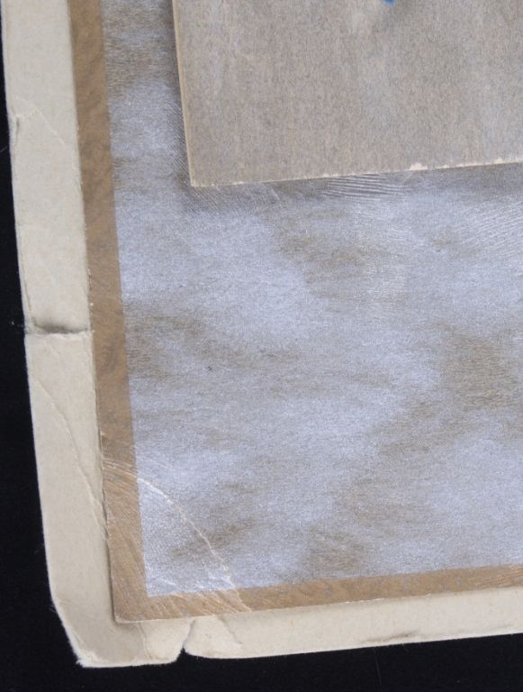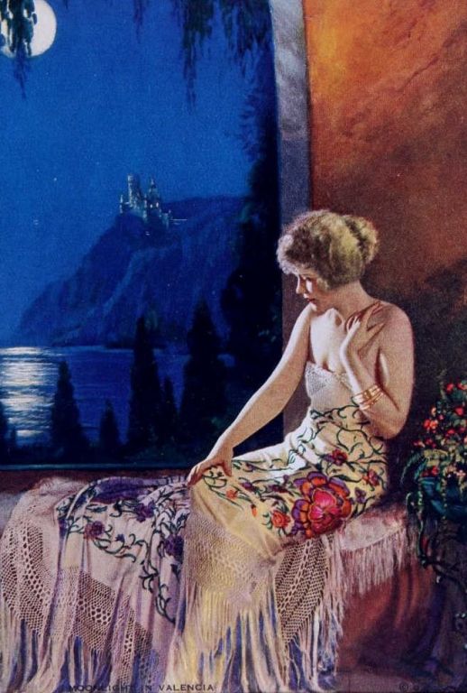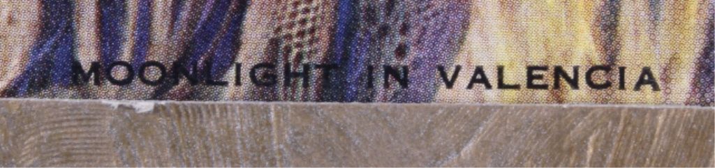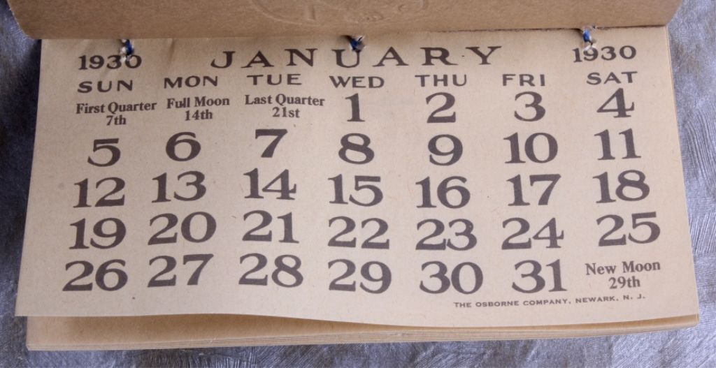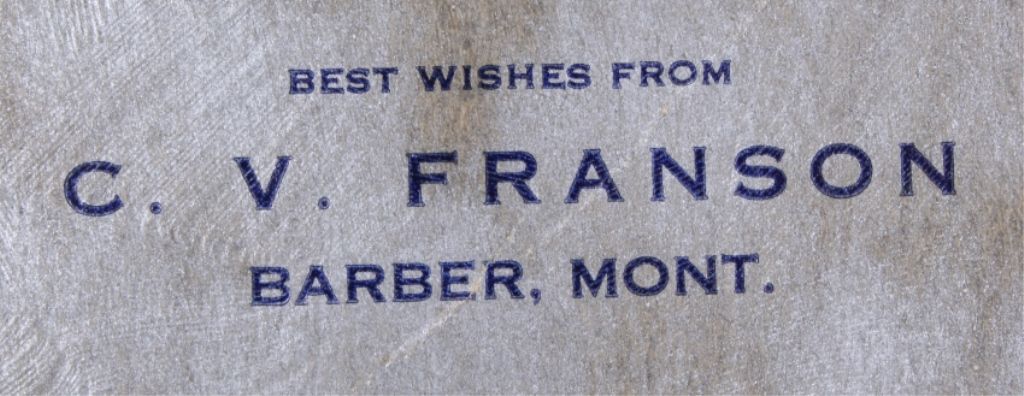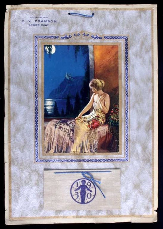 This is an original piece of early advertising from Barber, Montana. The piece is marked in the top right corner, "Best Wishes From C.V. Franson Barber, Mont." and shows the 'Moonlight in Valencia" print. Thepiece has a complete 1930's January through December calendar. Copyright The Osborne Company, Newark, N.J." Measures 9"x13" and the cardboard backing is 9 1/4"x13 5/8"