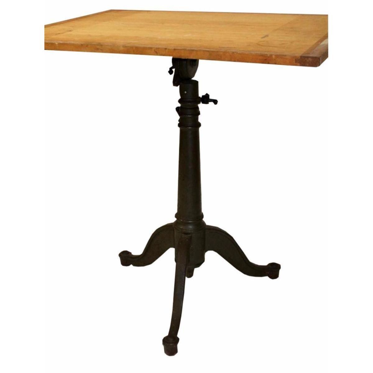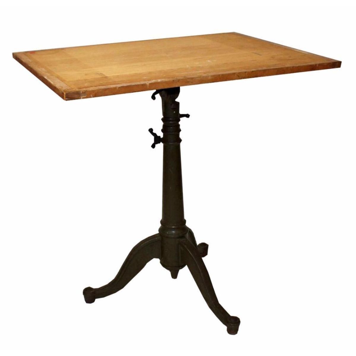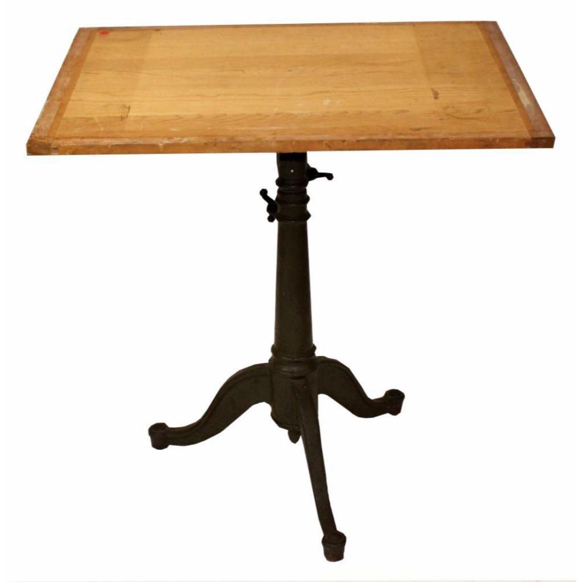 1930's cast iron base drafting table with planked pine top. Adjustable height. Tilt-top. 31 1/2"h x 31"w x 23 1/4"d