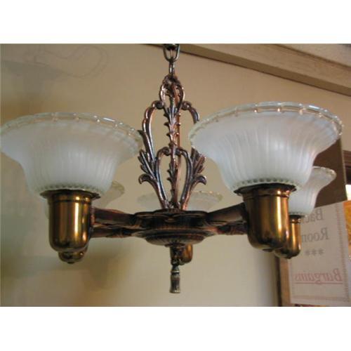 This outstanding 5-lite Deco chandelier from the 1930's is in excellent condition with all new wiring and sockets. We have completely cleaned and clearcoated the fixture for lasting beauty. The body and ceiling cap are made of cast iron and have a wonderful antique copper finish, while the socket holders are solid brass with an antique brass finish. The shades are vintage and in mint condition. They have a frosted and clear design which is really lovely. This would make a Eloquent statement in any room!!!