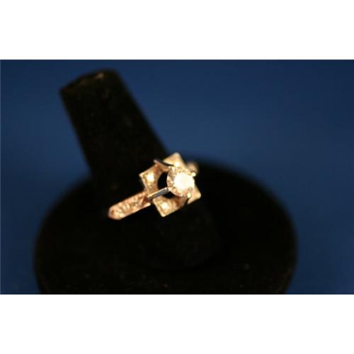 If you are looking for a unique engagement ring, this is it!!  A beautiful, SI-G color diamond of approximately .70 carats is set high above a square of smaller accent diamonds.  The squared off shoulders hold four more small diamonds of approximately one point each, for a total carat weight of.78.  The 14K white gold setting is dramatic and unique.  This beautiful ring is a size 5.5 (sizable by me or by your jeweler) and weighs 3.1 grams.