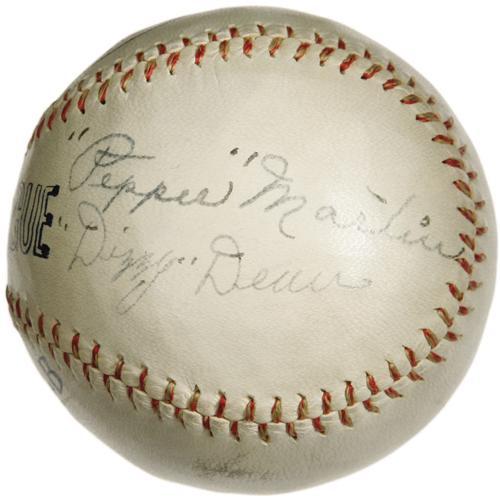 <B>1930's Dizzy Dean & Pepper Martin Signed Baseball.</B></I> Serious Cardinals collectors will not want to miss the rare opportunity to own a ball signed by two of the club's great pre-war figures. Sharing a side panel of an unofficial sphere are "Pepper" and "Dizzy," each of whom present with fine 8+/10 boldness. The ball maintains a luscious, creamy tone. <I>LOA from PSA/DNA. LOA from James Spence Authentication.</B></I><BR><BR><b>Shipping:</b> Balls, etc. (<a target="_blank" href="http://www.heritageauctions.com/common/shipping.php">view shipping information</a>)