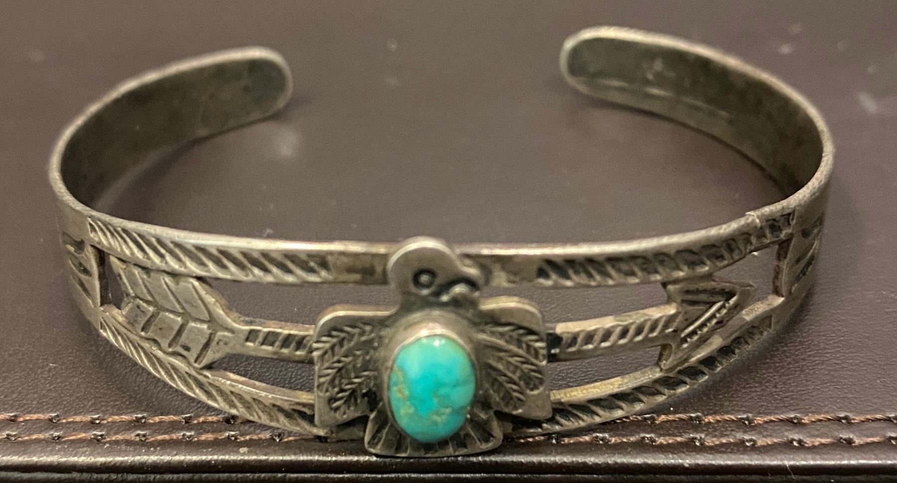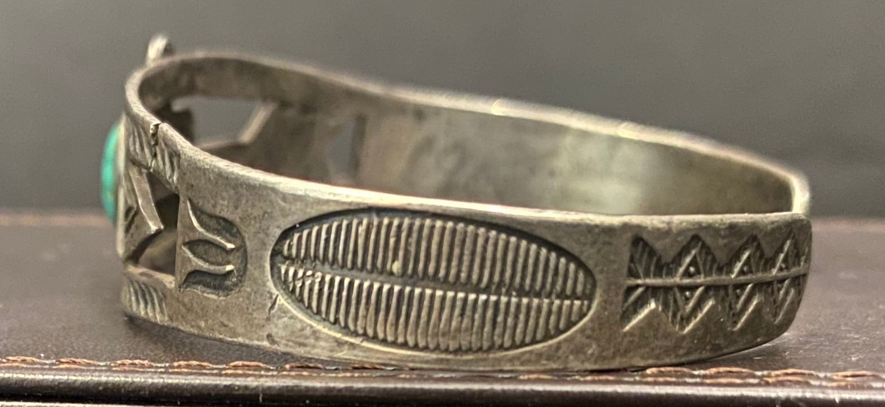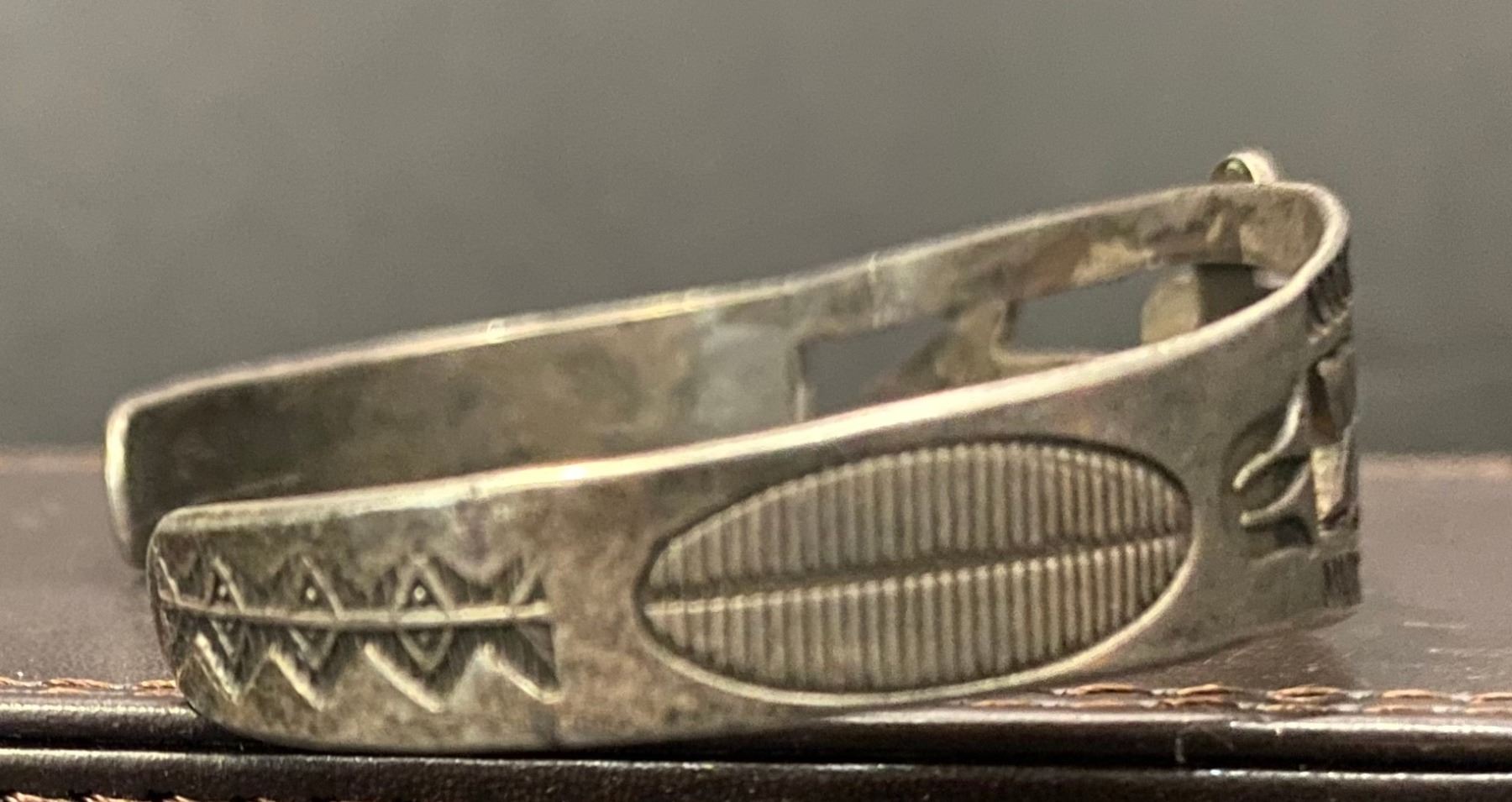 Bracelets measurements are opening, inside circumference, height. Weights are in Grams and are weighed to the best of our ability. The term signed means that, in our opinion, the signature is by the artist. All dating, Turquoise and hallmark attributions are to the best of our knowledge. Attributions are subjective and should be taken as such. Attributions in the description of any lot is left to the buyer to determine accuracy and the gallery is not responsible for any errors or omissions.