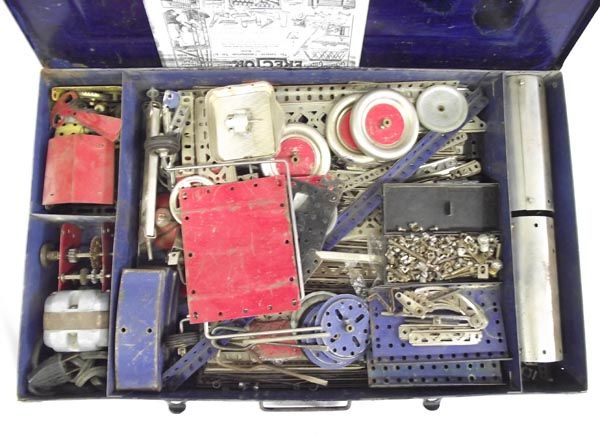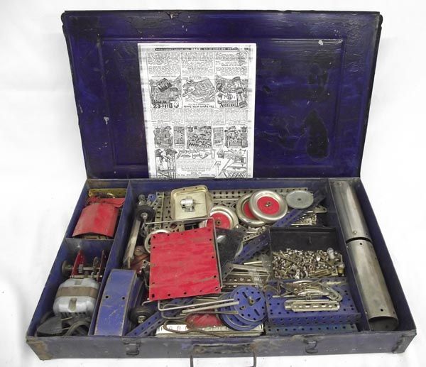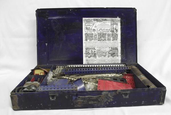 1930's Gilbert Erector Set Metal Box. Large set, well-played with condition; also has electric motor. Box measures 22'' x 13'' x 3''.