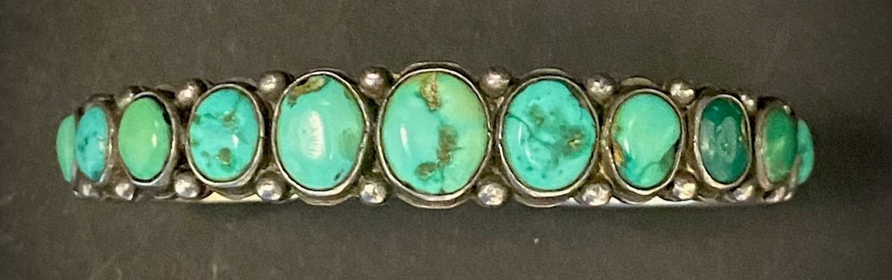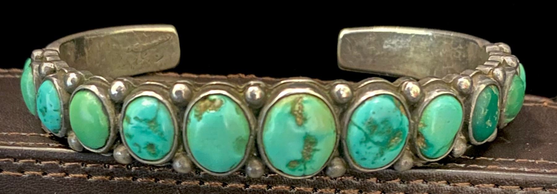 1930's Green Turquoise Row Ingot Cuff by unknown Artist. From an estate collection 1 1/2"H X 5 1/2" inside X 1" opening. 42 grams. 13 turquoise stones