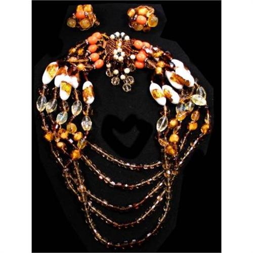Beyond stunning is this HEAVY ( 204 grams) Venetian glass 5 strand choker and matching clip on earrings! Looks like a Haskell or a Haegar. Necklace is just so well made and has this large thick chunky glass tasseled slide in dangle clasp. There are rhinestone roundels near the front of the coral colored beads that add to the charm of this lovely piece. The shortest strand is 15". The beads on this are of such a wide variety too from golden topaz color to lovely citrine color. This is so well designed that it has a wonderful pattern that forms this graduated design. All the beads on the necklace and the earrings are in great shape and are quite large. As you can see by the backs of the earrings and the large clasp the brass has turned to a lovely old color that is common in pieces from the 20's and 30's. The pearls on the clasp have lost their shine. I have never had one this large and this magnificent so don?t miss out on this vintage set. There are no PLASTIC beads on this fabulous set.