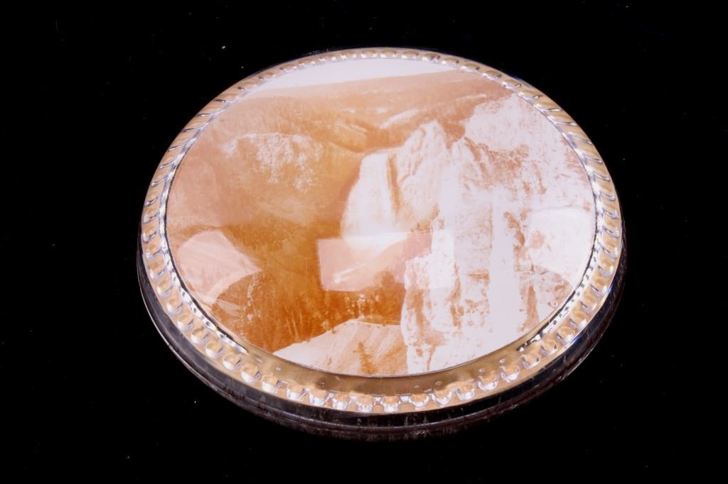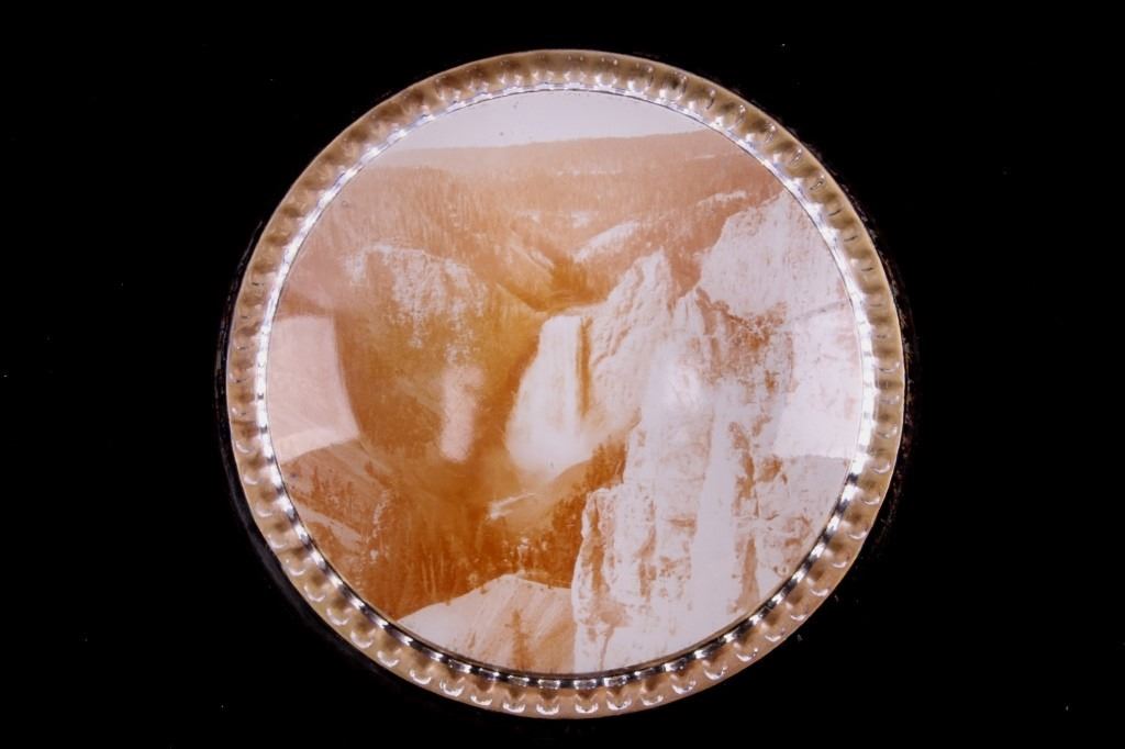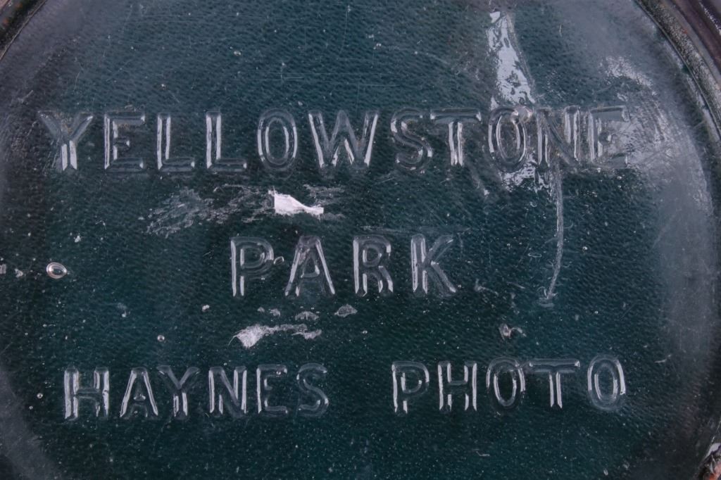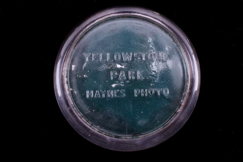 For your consideration is this Yellowstone Park Haynes Photograph Souvenir paperweight, circa 1930's. The photograph is of The Lower Falls of Yellowstone National Park in sepia. The lower falls were described as, "A grander scene than the lower cataract of the Yellowstone was never witnessed by mortal eyes.” At 308 feet, the Lower Falls is the tallest waterfall in the park. In terms of height alone, it’s more than twice the size of Niagara Falls. The souvenir photograph is encased in a thick glass, dome-shaped paperweight. On the bottom, in raised glass, is "Yellowstone Park Haynes Photo". The condition of this souvenir is in good condition, with some wear from age. This souvenir is 4" in diameter.
