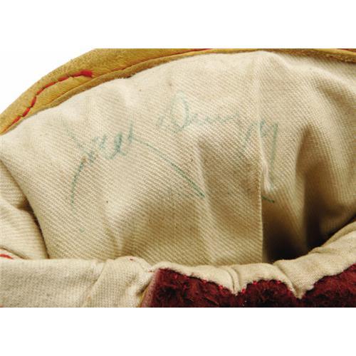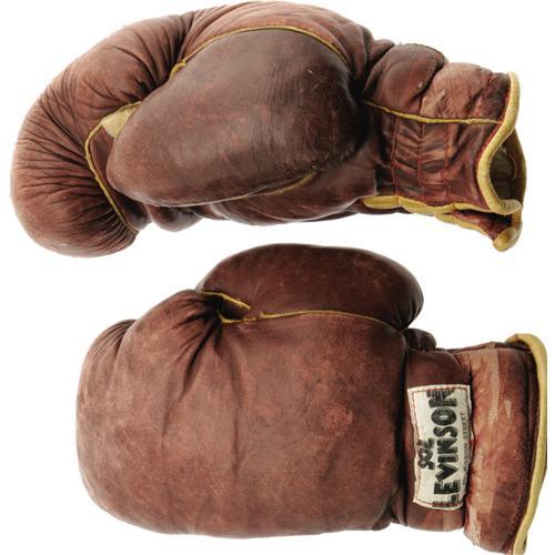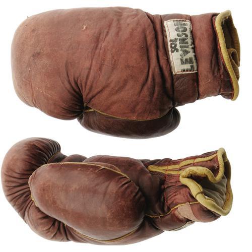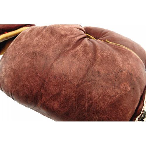 <B>1930's Jack Dempsey Exhibition Fight Worn & Signed Gloves.</B></I> Though the Manassa Mauler announced his retirement from the fight game in March of 1928, just six months after his loss to Gene Tunney in the famed "Long Count" fight, it is well documented that he continued to tour the country and participate in exhibition bouts, the boxing equivalent to baseball's "barnstorming" days. Presented here is a pair of gloves believed to have been used at one of those exhibitions, dating from the 1930's or 1940's and manufactured by noted glove maker "Sol Levinson," whose manufacturer's patch appears at each wrist. The fourteen-ounce gloves remain in terrific condition, with only slight cracking of the leather at the wrists, not materially affecting display value. Each glove bears a large black ink signature on the back of the hand, and while these do not contrast particularly well against the red hide, they technically rate 8/10 in quality. Each glove offers a second signature on the white lining of the interior wrist, with these presenting much better in 8/10 blue ink. With the few professional fight worn Dempsey gloves ever made available to the hobby commanding astronomical prices, this is a special opportunity for a collecting mortal to bring the Golden Age's greatest boxing figure into his collection. <I>LOA from PSA/DNA & Craig Hamilton/ JO Sports.</B></I> <BR><BR><B>Important notice:</B> Heritage usually auctions material at the rate of 200-250 lots per hour. On some occasions eBay Live bid software or the Internet may not be able to keep up with the pace of the auction. We recommend placing a realistic absentee bid now as insurance to avoid disappointment. Occasionally the auctioneer may eliminate or reject an eBay Live bid, and the auctioneer may also reopen a lot after the close of the eBay live bidding (usually because we missed an audience bid), and may reject your bid even if it shows you as the winning bidder. By bidding via eBay Live, you agree that Heritage may award the lot to another bidder at its sole discretion under the circumstances described above or any other reasonable circumstances. Since eBay bids are not shown to us until we open the lot on the floor, we treat those bids just like floor bids. In most cases the floor responds before the eBay bid is presented to us, due to Internet lag time, so for consistency we have made it a policy that floor bids are always considered first over tie eBay live bids. Also please note that all Heritage lots purchased through eBay Live carry a 22.5% Buyer's Premium. Please make sure you read the Terms and Conditions before you bid. This lot is being auctioned in conjunction with a live floor auction by Heritage Galleries & Auctioneers. All final auction and invoice information will be supplied by Heritage Galleries & Auctioneers, and all other information should be considered preliminary. Lot:19153 <BR><BR><B>Winning Notification and Billing:</B> After the FINAL session in this auction is complete, Heritage will send e-mail and snail mail invoices. This process normally takes several days. All final auction and invoice information will be supplied by Heritage Galleries & Auctioneers, and all other information should be considered preliminary. <BR><BR>This auction will be conducted on a live auction floor and over the Internet through eBay Live. If you choose to place an absentee bid, please take a moment to <font color='#0000ff'><u><a href='http://pages.ebay.com/liveauctions/help/before/laabsentee.html'>learn how eBay Live absentee bidding works</a></u></font><font color='#000000'>