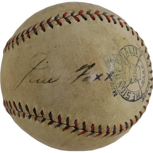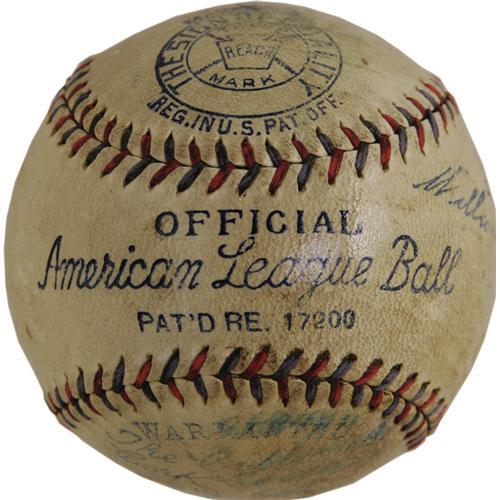 <B>1930's Jimmie Foxx Signed Baseball.</B></I> Only the most eagle-eyed among us could spot what PSA/DNA claims to be ink remnants or a possible removed signature on an opposite panel. To the rest of us, this OAL (Harridge) ball looks for all the world to be the elusive Foxx single, a sphere coveted by Hall of Fame and 500 Home Run Club collectors alike. The Beast's side panel "Jim Foxx" autograph averages an impressive 8/10 in boldness, and presents marvelously against the lightly tanned hide of the apparently game used baseball. Is it possible that the alleged signature removal is only scuffing from game play? One smart collector is going to get a real bargain here, as this ball would sell for a mint if it could be definitively labeled a single. <I>LOA from PSA/DNA.</B></I>