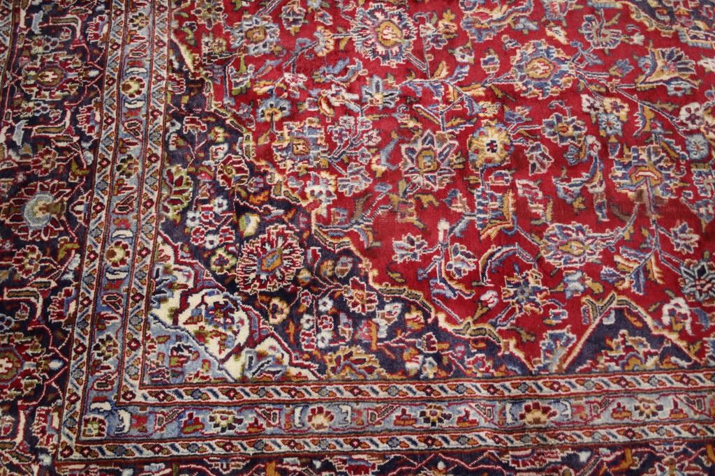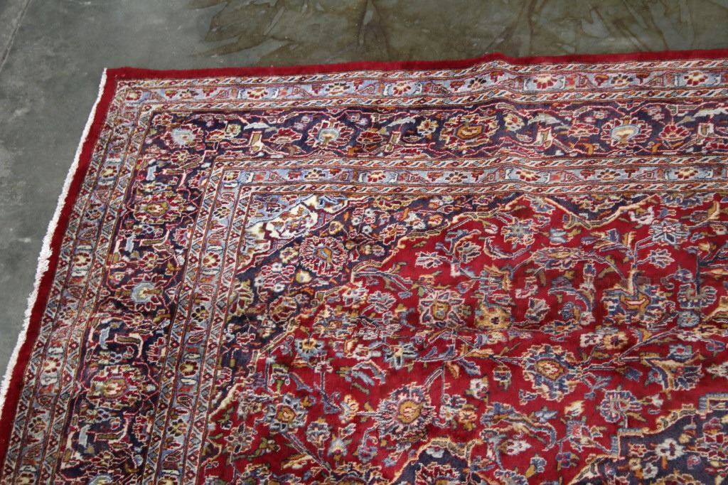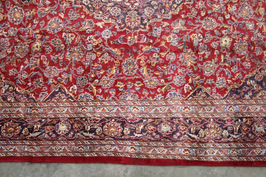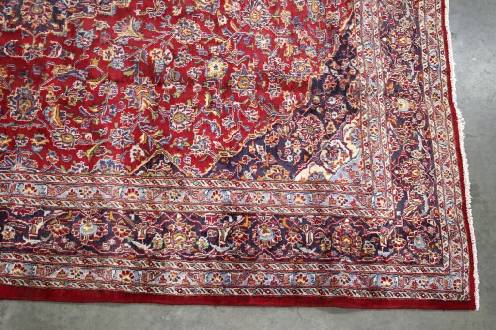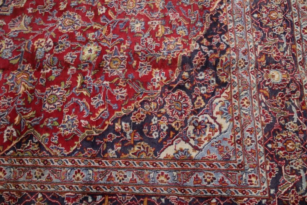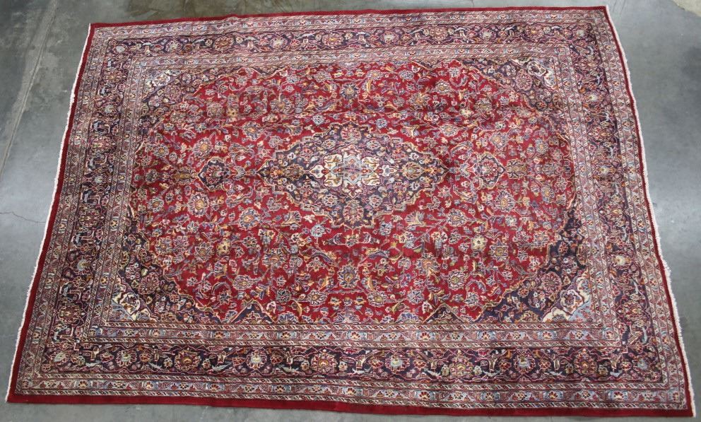 Included in this lot is a Kashan Persian hand knotted wool area rug originating from 1930's. This is a wonderfully patterned Persian rug from a city in the northern part of Isafahan province, Iran. The rug features lovely designs and high thread count. The medallion and corner pattern on an ornately patterned floral field is a trademark of Kashan rugs. The colors used in the design are usually a combination of deep blues, rich reds, and cream with occasional splotches of yellow, green, and burnt orange. The rug features four borders, each showing geometric floral designs. The piece shows good condition overall, with little wear and use. The rug measures 114" wide by 155" long.