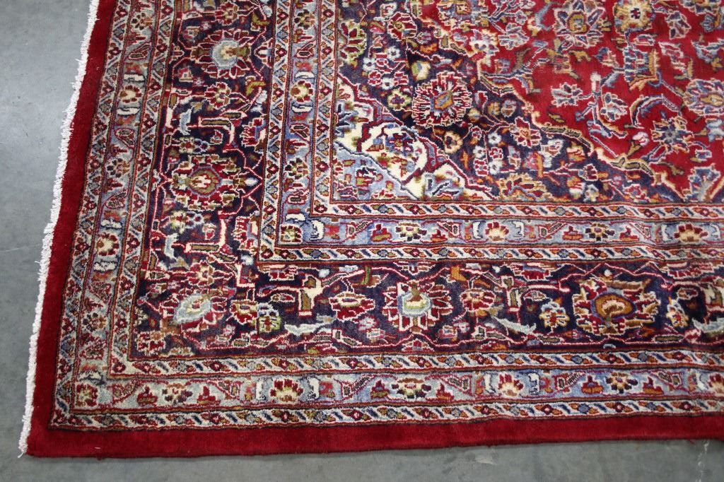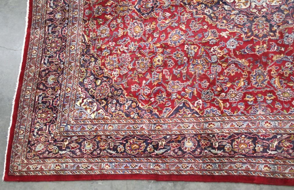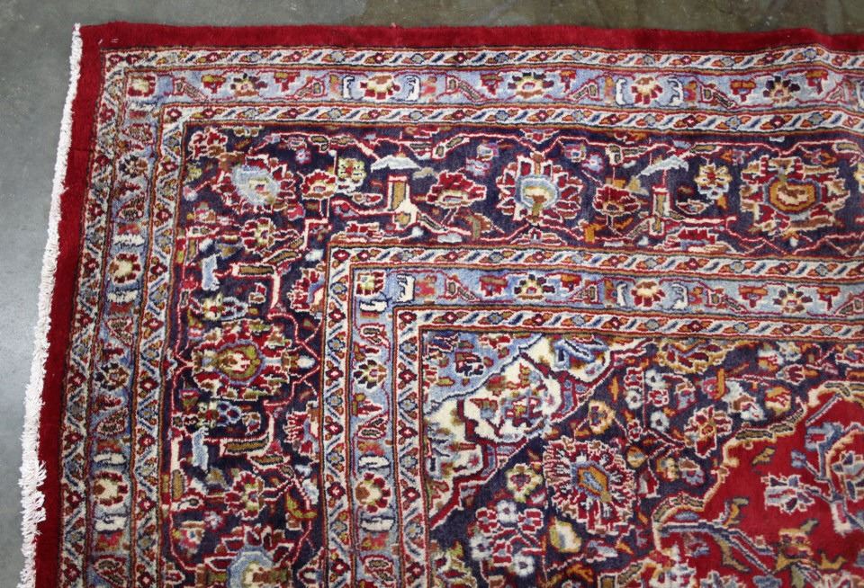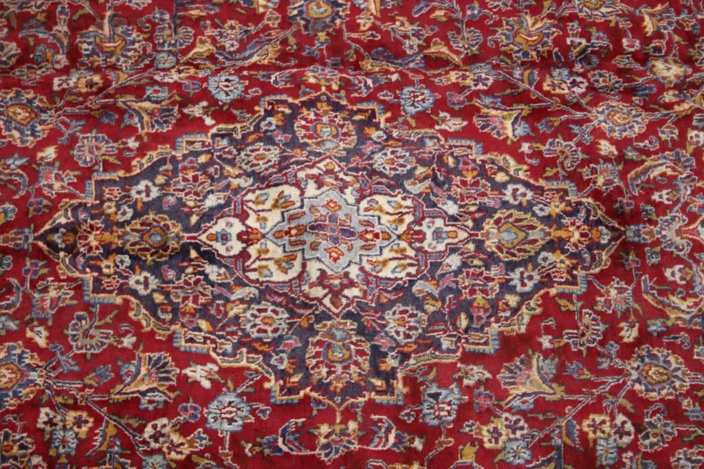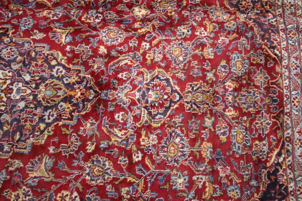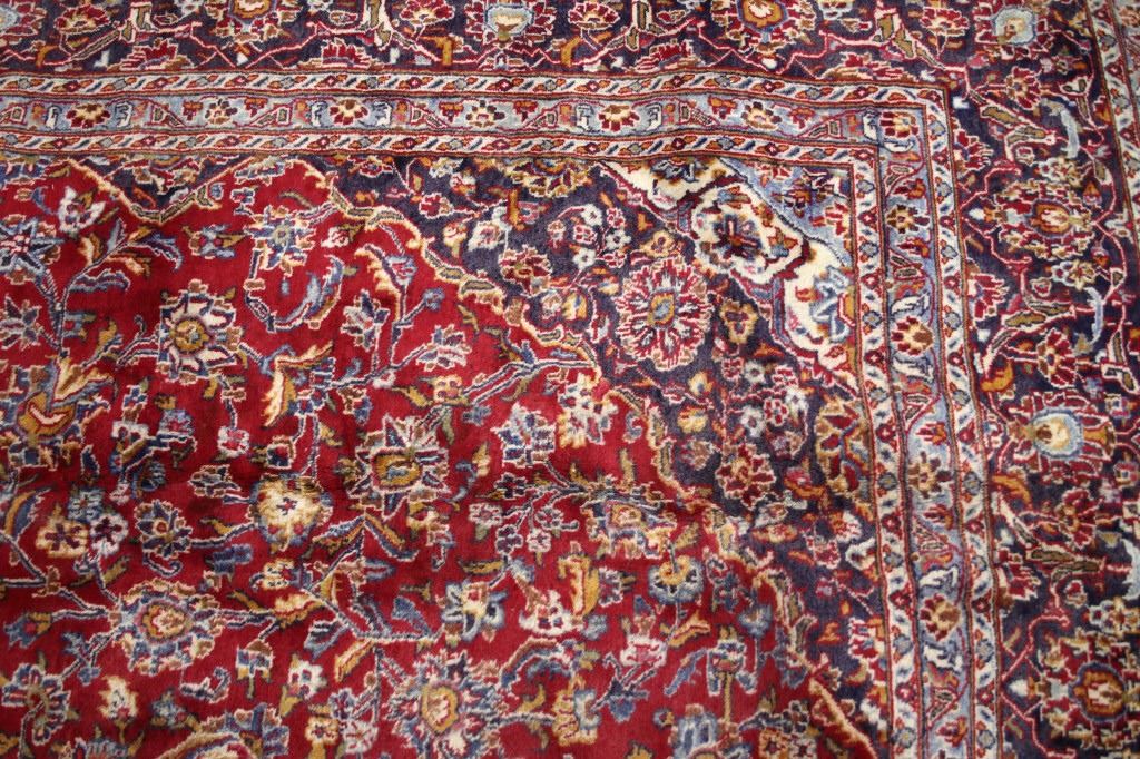 Included in this lot is a Kashan Persian hand knotted wool area rug originating from 1930's. This is a wonderfully patterned Persian rug from a city in the northern part of Isafahan province, Iran. The rug features lovely designs and high thread count. The medallion and corner pattern on an ornately patterned floral field is a trademark of Kashan rugs. The colors used in the design are usually a combination of deep blues, rich reds, and cream with occasional splotches of yellow, green, and burnt orange. The rug features four borders, each showing geometric floral designs. The piece shows good condition overall, with little wear and use. The rug measures 114" wide by 155" long.