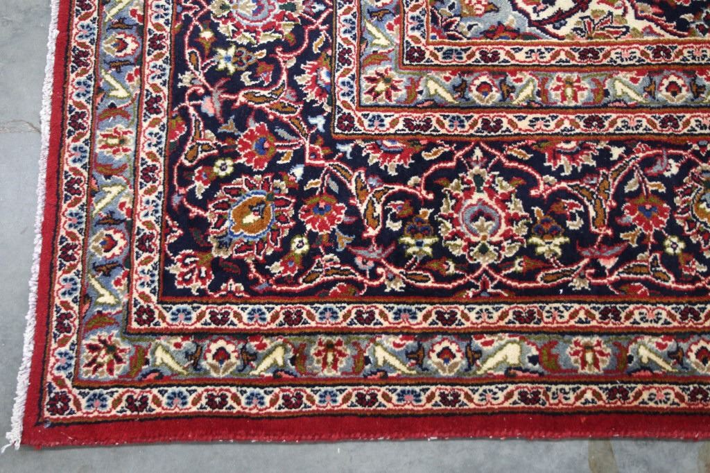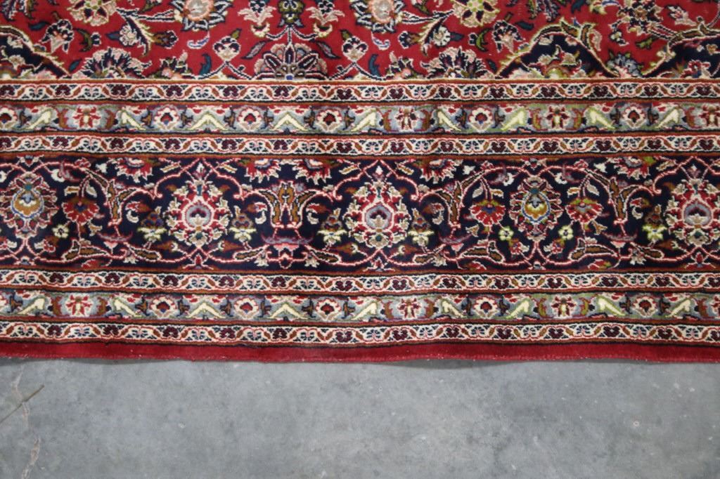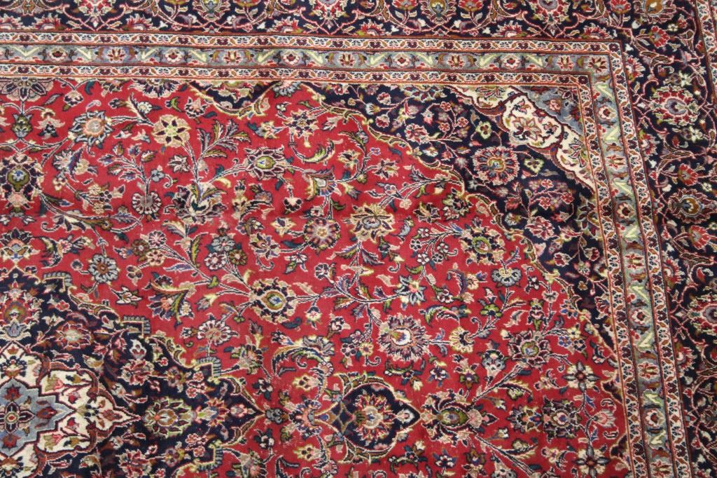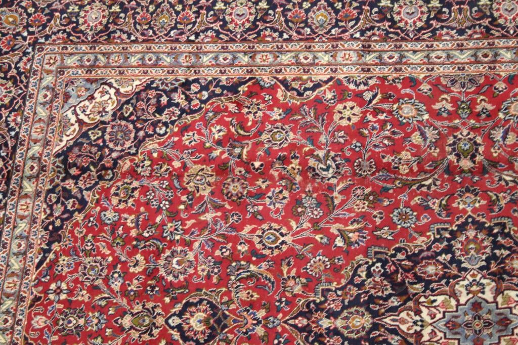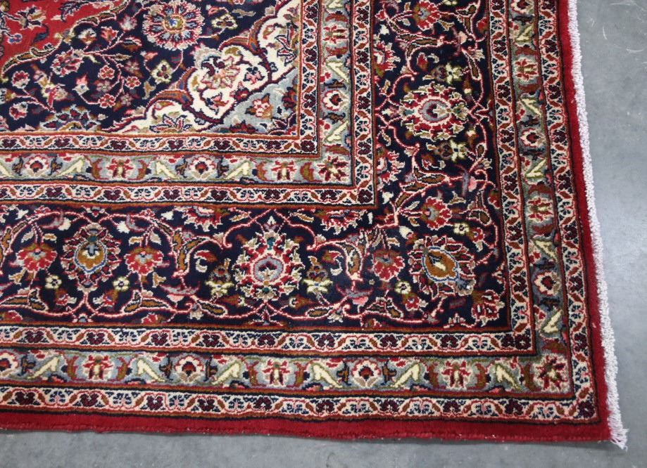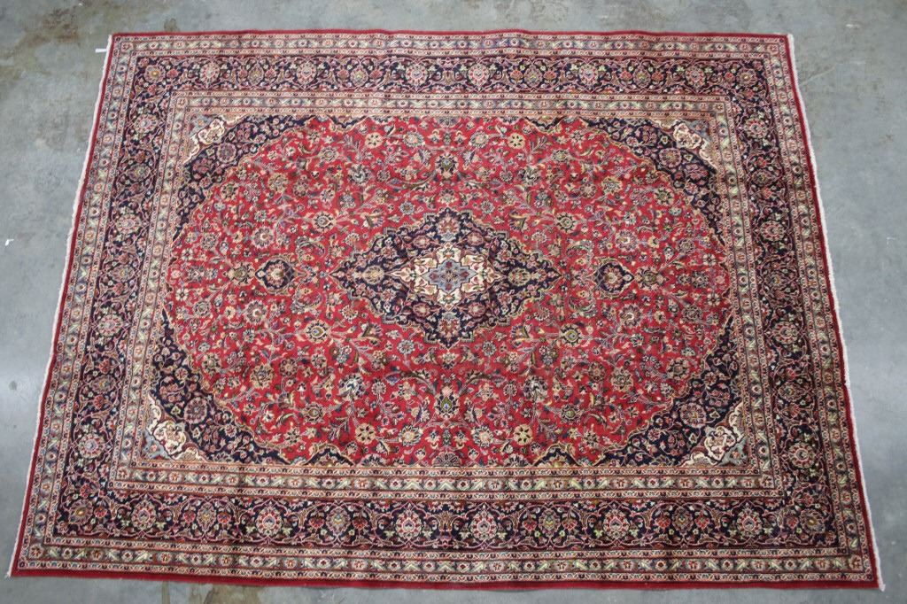 Included in this lot is a Kashan Persian hand knotted wool area rug originating from 1930's. This is a wonderfully patterned Persian rug from a city in the northern part of Isafahan province, Iran. The rug features lovely designs and high thread count. The medallion and corner pattern on an ornately patterned floral field is a trademark of Kashan rugs. The colors used in the design are usually a combination of deep blues, rich reds, and cream with occasional splotches of yellow, green, and burnt orange. The rug features four borders, each showing geometric floral designs. The piece shows good condition overall, with little wear and use. The rug measures 148" long by 114" wide.