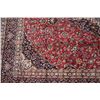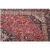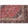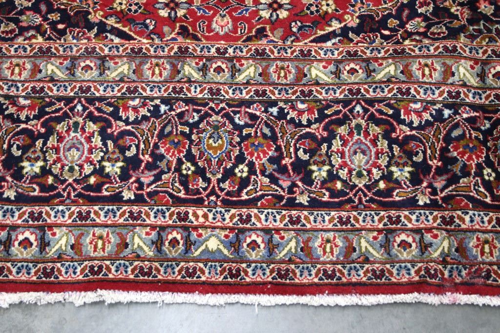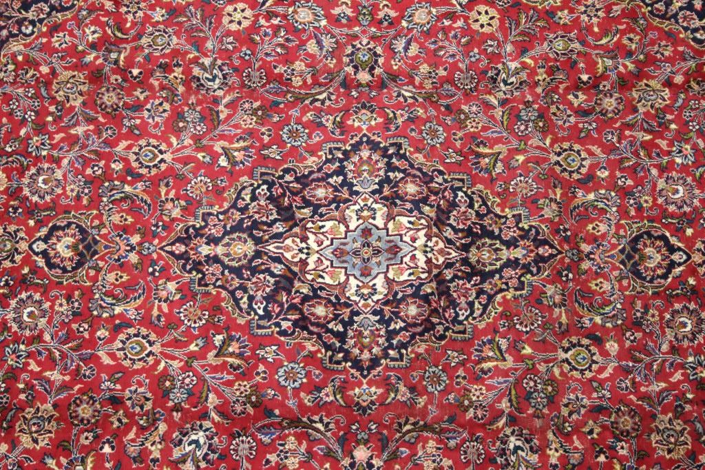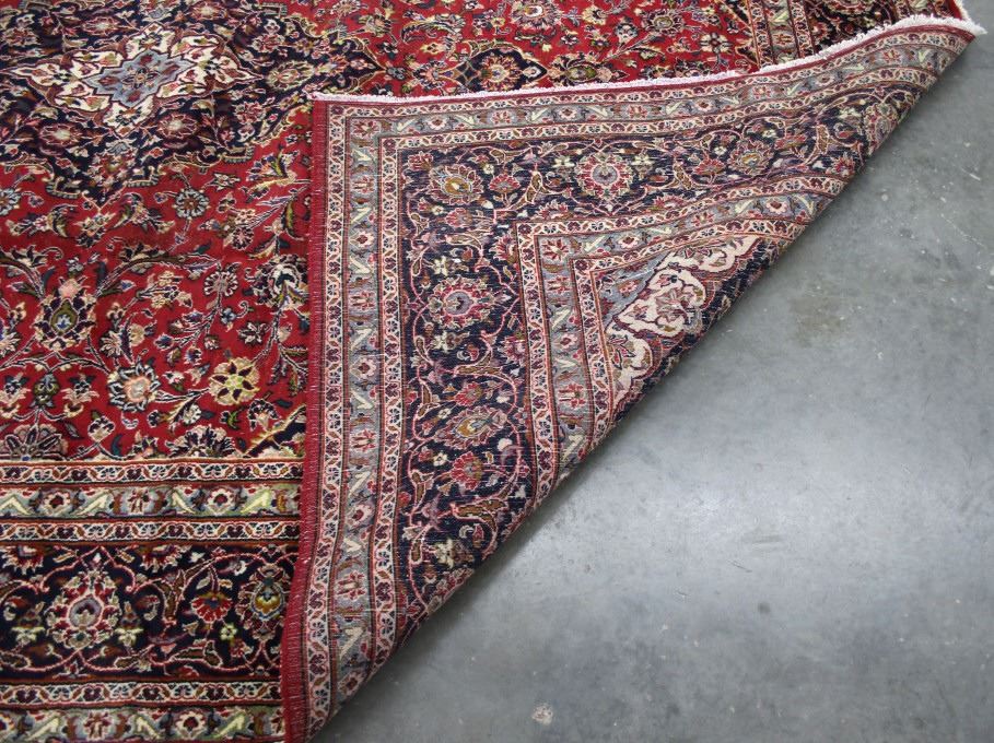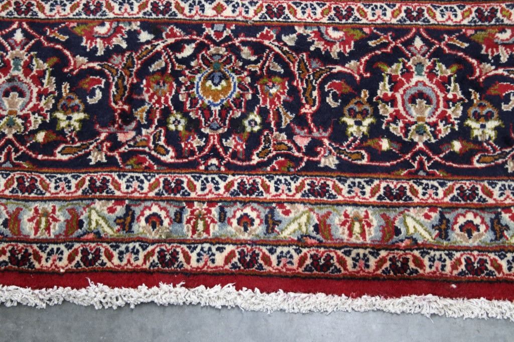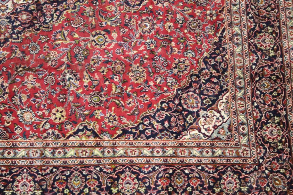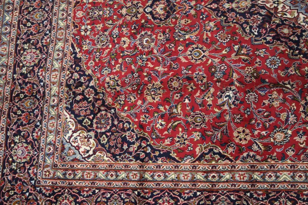 Included in this lot is a Kashan Persian hand knotted wool area rug originating from 1930's. This is a wonderfully patterned Persian rug from a city in the northern part of Isafahan province, Iran. The rug features lovely designs and high thread count. The medallion and corner pattern on an ornately patterned floral field is a trademark of Kashan rugs. The colors used in the design are usually a combination of deep blues, rich reds, and cream with occasional splotches of yellow, green, and burnt orange. The rug features four borders, each showing geometric floral designs. The piece shows good condition overall, with little wear and use. The rug measures 148" long by 114" wide.