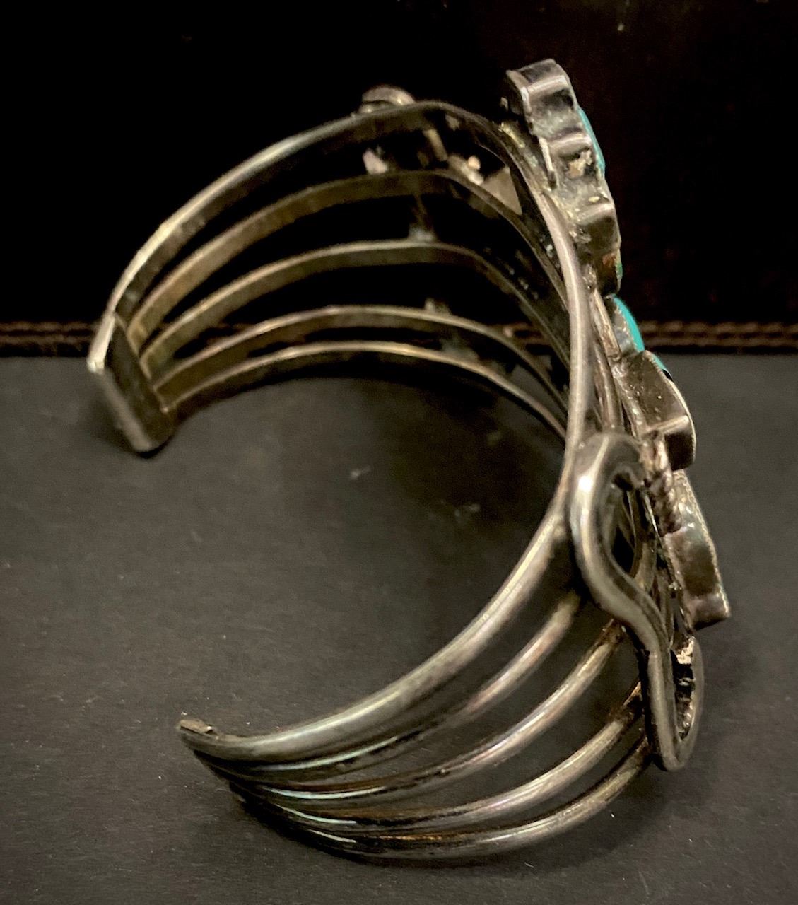 Bracelets measurements are opening, inside circumference, height. Weights are in Grams and are weighed to the best of our ability. The term signed means that, in our opinion, the signature is by the artist. All dating, Turquoise and hallmark attributions are to the best of our knowledge. Attributions are subjective and should be taken as such. Attributions in the description of any lot is left to the buyer to determine accuracy and the gallery is not responsible for any errors or omissions.