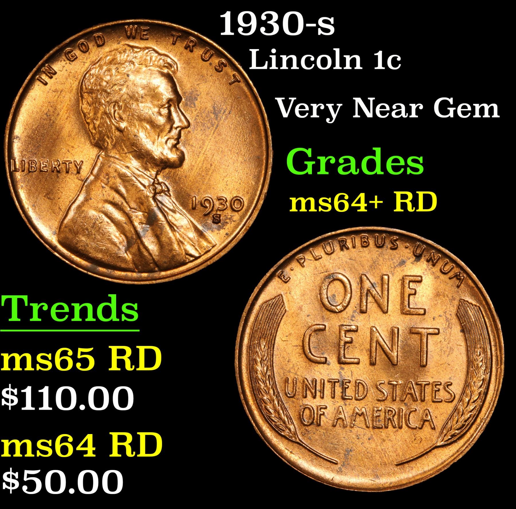 1930-s Lincoln Cent 1c Grades Choice+ Unc RD. Very Near Gem