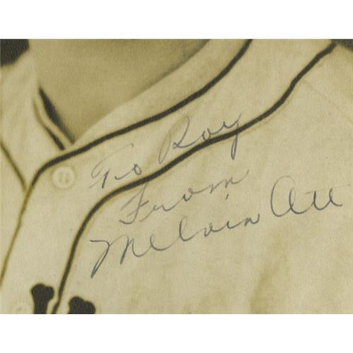 <B>1930's Mel Ott Signed Photograph by Burke.</B></I> Another masterwork by George Burke, whose photographs continue to escalate in value with every passing year. This example is quite clearly a cut above the rest due to the 8/10 vintage ink inscription from the subject, reading, "To Roy From Melvin Ott." Knowledgeable collectors will understand how tough and desirable Ott signed photos are, and particularly those with the full first name rather than the standard "Mel." And, of course, the Burke pedigree (complete with stamping on verso), makes this one extra special. Several holes in the photo must be noted, but all but one (which has been rather effectively repaired) could quite easily be matted out for display. <I>LOA from PSA/DNA.</B></I> <BR><BR><B>Important notice:</B> Heritage usually auctions material at the rate of 200-250 lots per hour. On some occasions eBay Live bid software or the Internet may not be able to keep up with the pace of the auction. We recommend placing a realistic absentee bid now as insurance to avoid disappointment. Occasionally the auctioneer may eliminate or reject an eBay Live bid, and the auctioneer may also reopen a lot after the close of the eBay live bidding (usually because we missed an audience bid), and may reject your bid even if it shows you as the winning bidder. By bidding via eBay Live, you agree that Heritage may award the lot to another bidder at its sole discretion under the circumstances described above or any other reasonable circumstances. Since eBay bids are not shown to us until we open the lot on the floor, we treat those bids just like floor bids. In most cases the floor responds before the eBay bid is presented to us, due to Internet lag time, so for consistency we have made it a policy that floor bids are always considered first over tie eBay live bids. Also please note that all Heritage lots purchased through eBay Live carry a 22.5% Buyer's Premium. Please make sure you read the Terms and Conditions before you bid. This lot is being auctioned in conjunction with a live floor auction by Heritage Galleries & Auctioneers. All final auction and invoice information will be supplied by Heritage Galleries & Auctioneers, and all other information should be considered preliminary. Lot:19064 <BR><BR><B>Winning Notification and Billing:</B> After the FINAL session in this auction is complete, Heritage will send e-mail and snail mail invoices. This process normally takes several days. All final auction and invoice information will be supplied by Heritage Galleries & Auctioneers, and all other information should be considered preliminary. <BR><BR>This auction will be conducted on a live auction floor and over the Internet through eBay Live. If you choose to place an absentee bid, please take a moment to <font color='#0000ff'><u><a href='http://pages.ebay.com/liveauctions/help/before/laabsentee.html'>learn how eBay Live absentee bidding works</a></u></font><font color='#000000'>