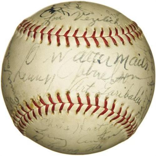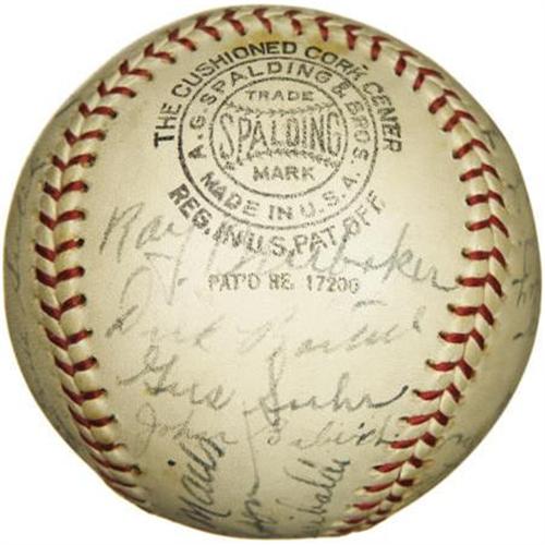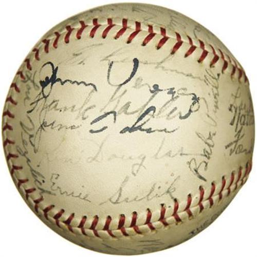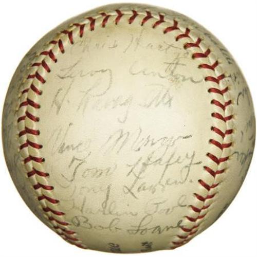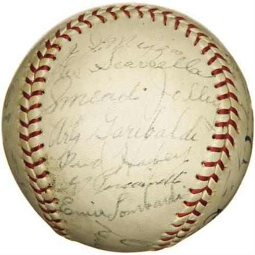 <B>1930's Multi-Signed Baseball with Lazzeri, Joe DiMaggio.</B></I> <I>UPDATE: Please note we have learned that this ball reflects the participants in a 1935 contest between Major and minor league players from the Bay Area.</B></I> We haven't quite been able to crack the code that would explain the unusual concoction of baseball talent that decorates this ONL (Frick) sphere, but perhaps the enterprising baseball historian will enjoy the project. The mystery certainly does nothing to diminish the obvious appeal, particularly in regard to the two Yankees Hall of Famers who anchor the roster. Lazzeri and DiMaggio appear in 7/10 and 6/10 black fountain pen ink respectively, well in line with the balance of the twenty-nine that join them. More notables: Ernie Lombardi, Dick Bartell, Gus Suhr and Cookie Lavagetto. The ball is very lightly and evenly toned, with no flaws of note. <I>LOA from PSA/DNA. LOA from James Spence Authentication.</B></I><BR><BR><b>Shipping:</b> Balls, Pucks, etc., Small (<a target="_blank" href="http://www.heritageauctions.com/common/shipping.php">view shipping information</a>)