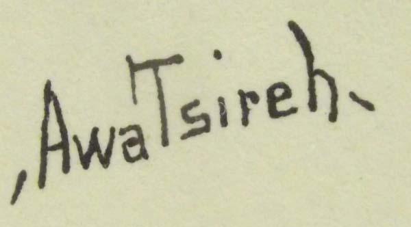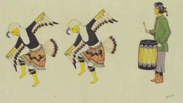 1930's Native American San Ildefonso Print by Awa Tsireh, framed and under glass, done in Europe, measures approx.14.75'' x 19.25'', Alfonso Roybal, who signed his paintings Awa Tsireh, gained widespread recognition as a painter during the 1920's and 1930's; his paintings are included in many major museum collections. Buyers Pay Actual Shipping and Handling Charges(see terms and conditions for more information) As a child in San Ildefonso Pueblo, Awa Tsireh sometimes painted pottery made by his mother, Alfonsita Martínez. Even before attending San Ildefonso Day School, where he was given drawing materials, Tsireh made sketches of animals and ceremonial dances. After completing day school, he began painting watercolors with his uncle, Crescencio Martínez