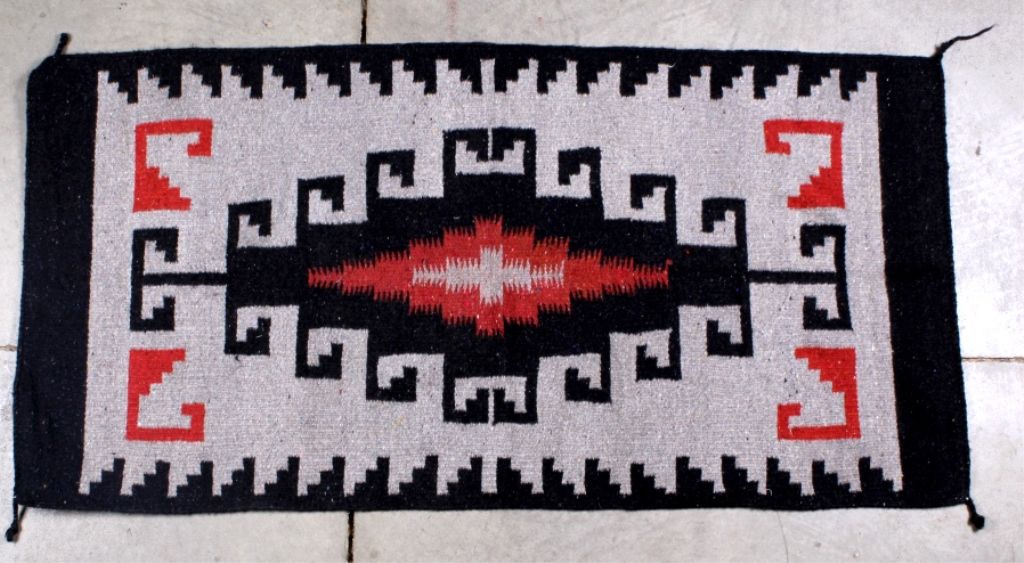 This lot features a 1930's Navajo rug. It is 100% wool. The pattern is a variation of the Crystal design. This rug is in very good condition. It measures 30" x 62'.