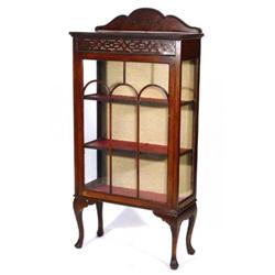 1930's Oak bookcase, the top with shaped back rail above a blind fretwork frieze and glazed door enclosing two shelves on cabriole legs