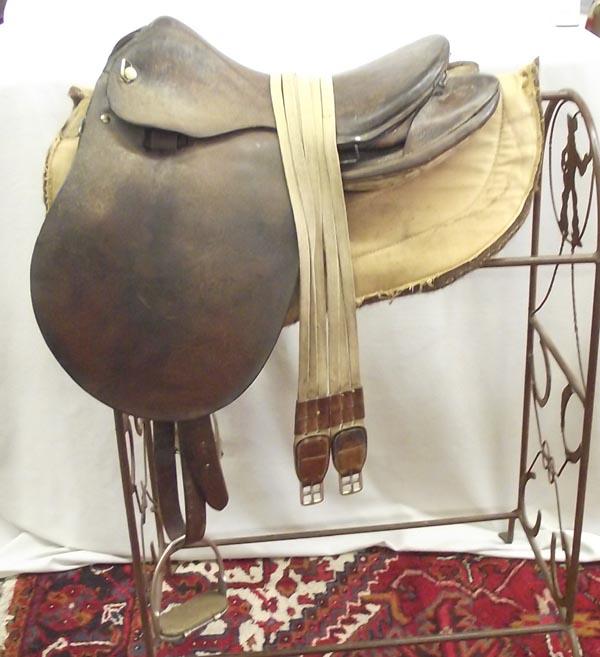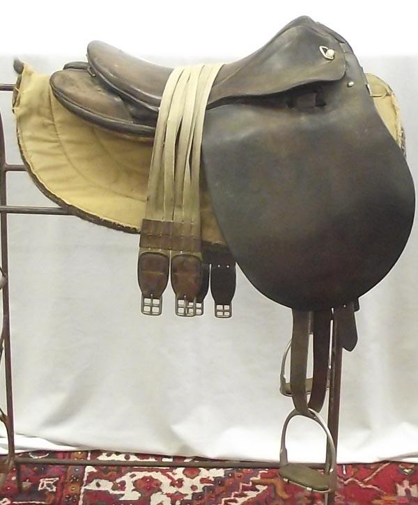 1930's Phillips Officer's Military Saddle, stirrups are marked England and have clip on foot pads, crupper and breast plate attachment places, 44'' girth, 15'' saddle, horsehair pad, leather protectors, Officer's saddles and equipment were different from that of enlisted men. The Phillips Military Saddle, Model 1936 was adopted in January 1937 as the standard officer's saddle. This saddle was developed by and named for Colonel Albert Phillips who also developed the pack saddle shown above. The Phillips saddle replaced the 2 or 3 saddles which officers were previously expected to procure: a field saddle, a jumping saddle and, in many cases a polo saddle. Buyers Pay Actual Shipping and Handling Charges(see terms and conditions for more information)