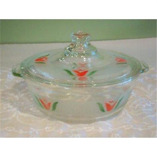 We offer a very hard to find Pyrex ovenware covered casserole dish with the fired on tulip design. This line by Pyrex was made in the 1930's and was the first fired on color decoration by the company. These were manufactured in small numbers and few survive today. The 1 1/2 quart casserole dish is clear oven glass with a wide band of frosted glass with the fired on red tulips and green leaves. The dish is embossed on the bottom; PYREX, 682-B-022-622-B. This is in very good condition with no chips or rough edges. The tulips are bright with no color loss. A great addition to a vintage kitchen, or Pyrex collection.